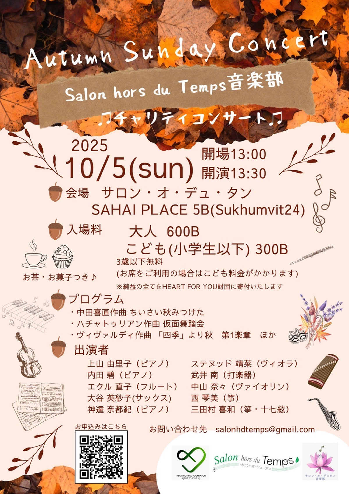 2025年10月5日(日)13時30分より、バンコクのサロン・オ・デュタン(スクンビットソイ24 サハイプレイス 5B)で「Autumn Sunday Concert」が開催されます。