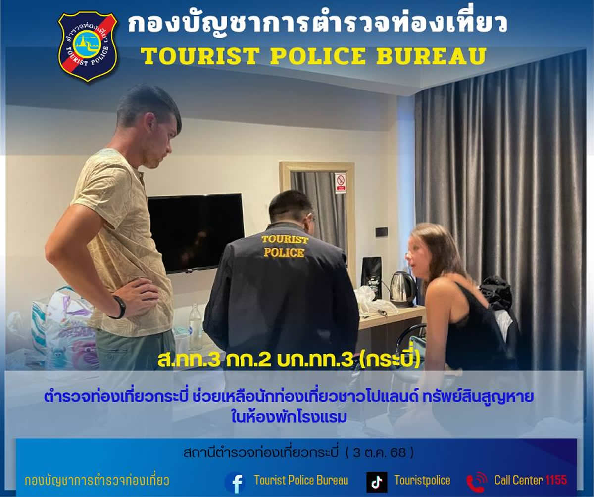 タイ南部クラビ県で2025年10月3日午後、ホテル宿泊中のポーランド人旅行者が現金を盗まれる被害に遭い、観光警察が対応しました。