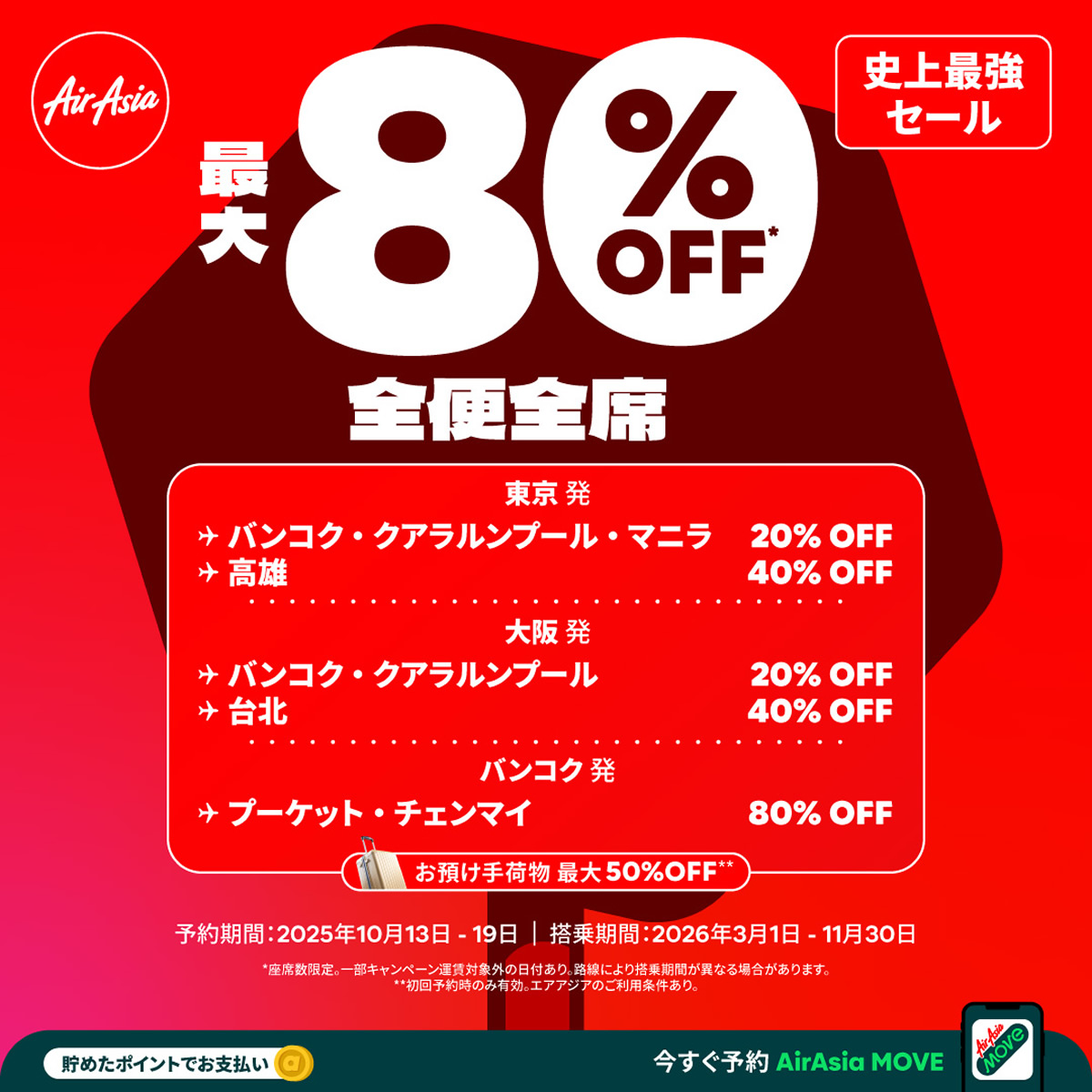 格安航空会社エアアジアは2025年10月13日より、2026年3月以降出発の全便・全席を対象に、通常運賃の20%〜最大80%OFFとなる「史上最強セール」を開始しました。予約期間は10月19日までで、2026年3月1日から11月30日までの搭乗分が対象です。