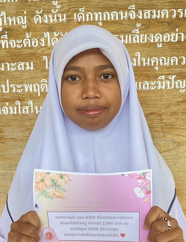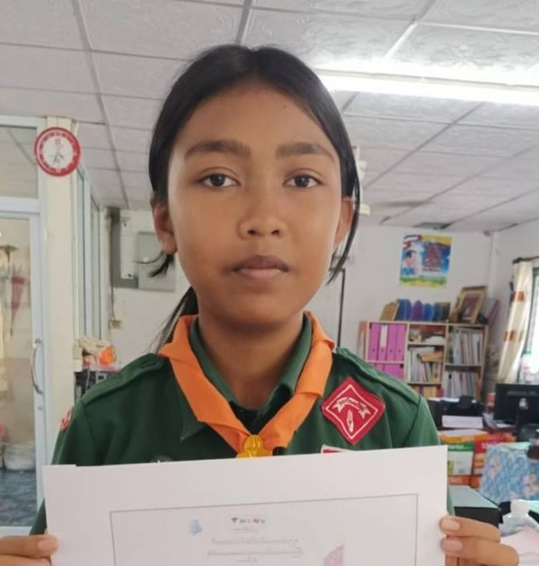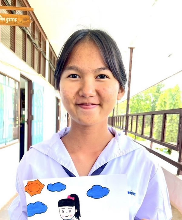 「物心ついたときから、おもちゃを持ったことも、きれいな服を着たことも、どこかに行ったこともありません。でも私には夢があり、そして今、機会があります。この奨学金をくださった寄付者の皆様に感謝します。いつか自分が学んだ学校でタイ語を教えられるよう、一生懸命勉強します。」