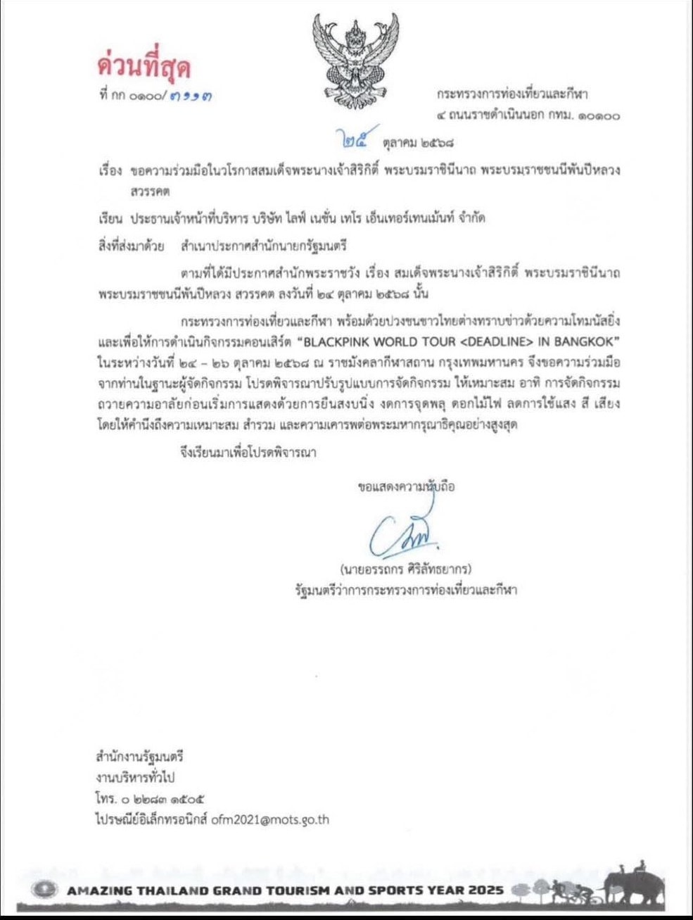 タイ観光・スポーツ省は2025年10月25日、バンコク・ラジャマンガラスタジアムで開催中の「BLACKPINK WORLD TOUR〈DEADLINE〉IN BANGKOK」(10月24〜26日)について、主催者に対し「王太后陛下への哀悼を示す形で実施するよう」協力を求めました。