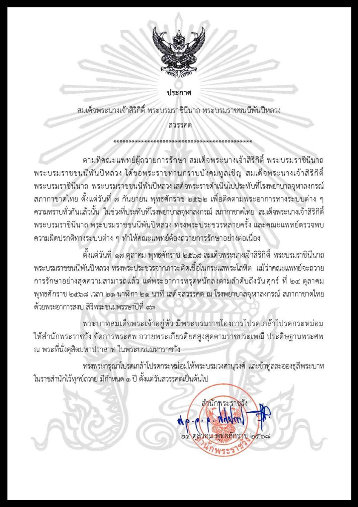 24日付けの発表(ラーマ10世の名による)によれば、崩御に際し、国葬および弔問の詳細は追って発表される予定で、王室葬儀委員会が準備を進めるよう指示が出されています。