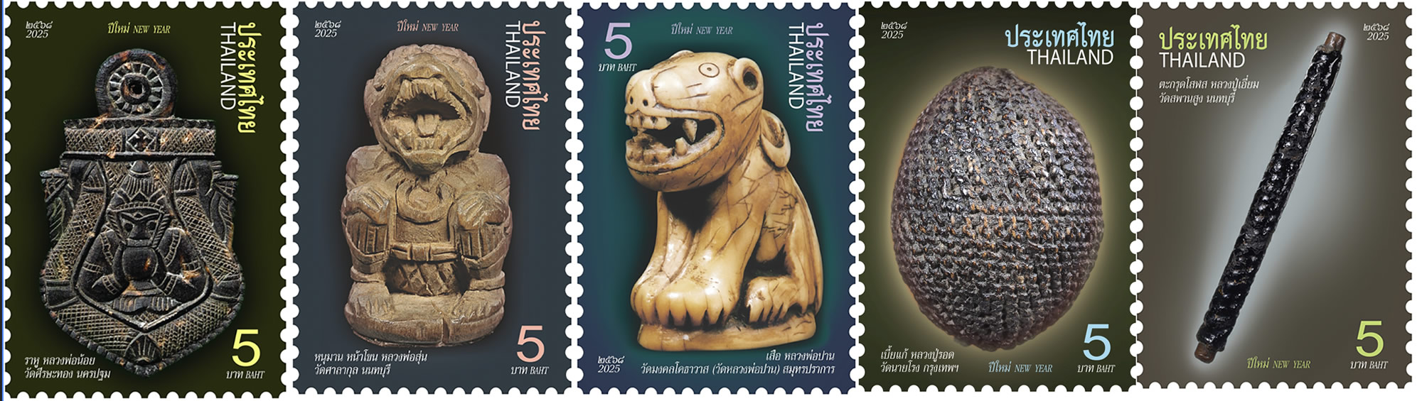 タイランドポスト社(Thailand Post) は、タイを代表する五大御守り「ベンチャパーキー(เบญจภาคี)」を題材にした特別切手シリーズを発表しました。2025年の年号を冠したこの切手は、来たる2026年の新年を縁起よく迎えるための記念シリーズとして制作されたもので、信仰と芸術を融合させた“最も小さな御守り”ともいえる作品です。