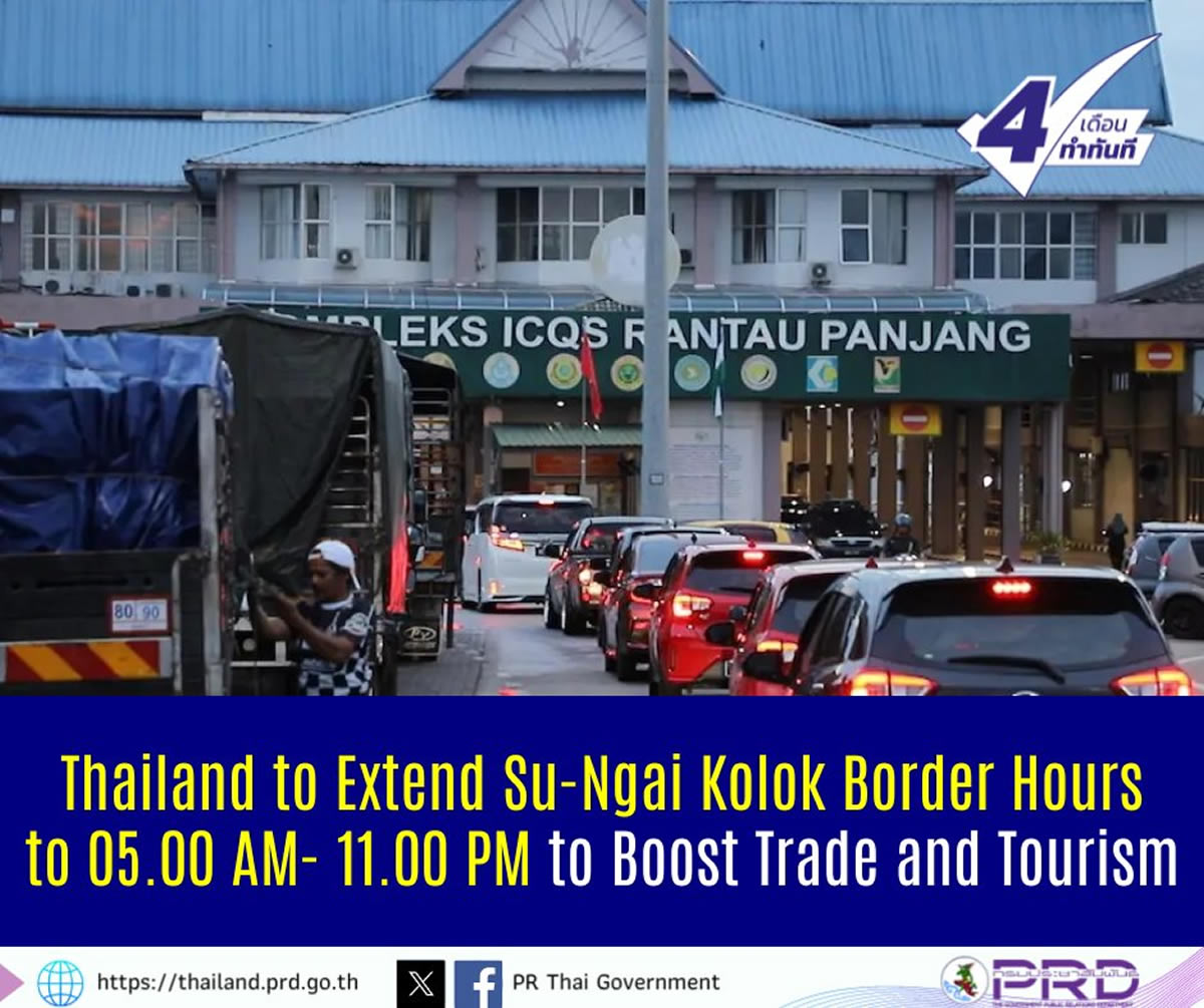タイ観光・スポーツ省は、ナラティワート県とマレーシア・ランタオパーンジャンを結ぶ最大級の国境取引拠点であるスンガイコーロク国境検問所について、現在の「午前5時〜午後9時」から「午前5時〜午後11時」まで営業時間を延長する案を検討しています。2025年11月10日にタイ広報局が伝えています。