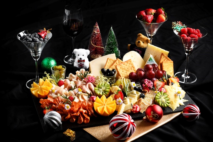 コミューナルテーブルにはチーズ、シャルキュトリー、サーモングラブラックス、フェスティブスイーツが並びます。