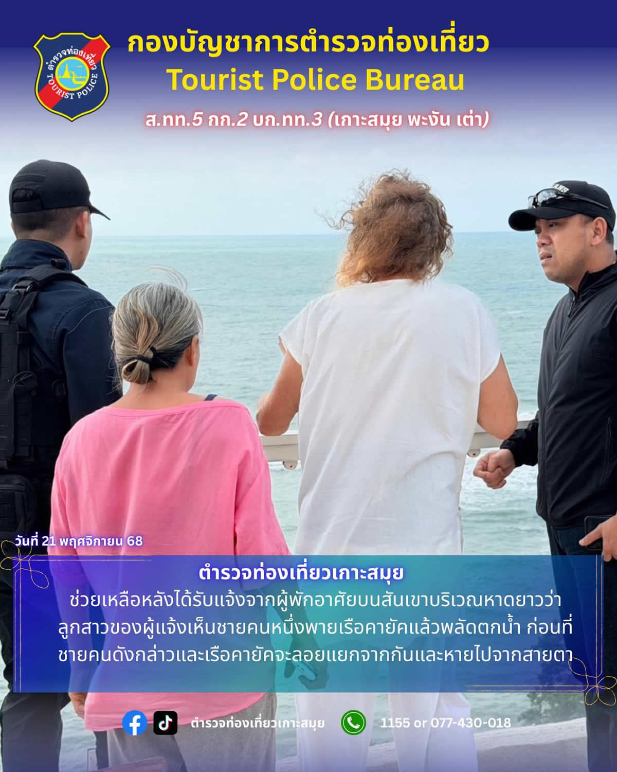 サムイ島観光警察は2025年11月21日、ハードヤオ(Haad Yao)付近の高台に住む住民から「娘が、男性がカヤックを漕いでいて海に転落する様子を見た」との通報を受け、現場周辺の捜索を行いました。