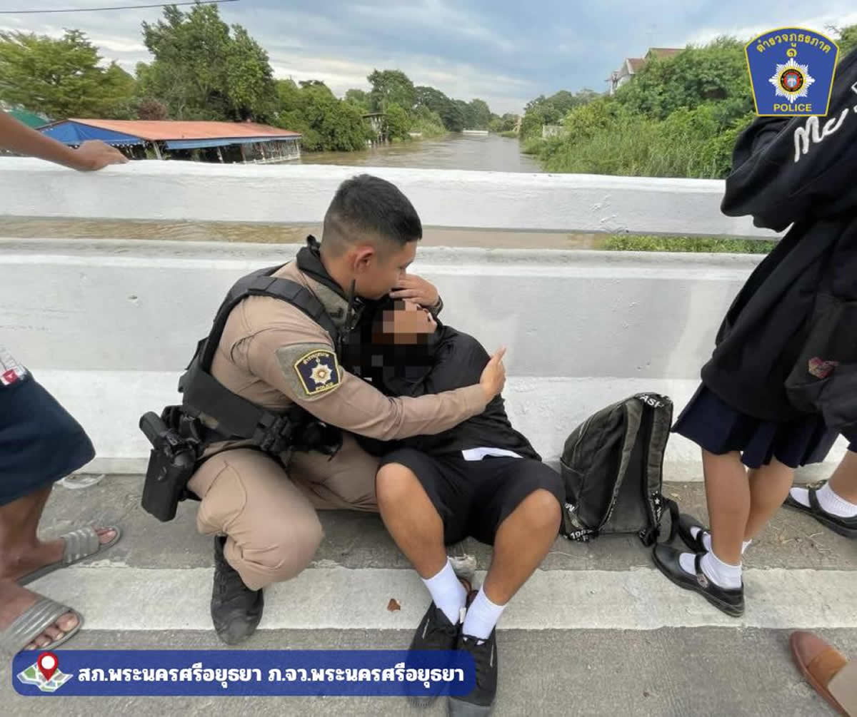 アユタヤの橋付近で男子生徒が不安な様子で立っているとの通報を受け、アユタヤ警察署の巡回隊が現場に急行。到着した警察官は、生徒が強いストレスを抱えて泣いている様子を確認しました。生徒の手には悩みを書き記した紙が握られていたといいます。