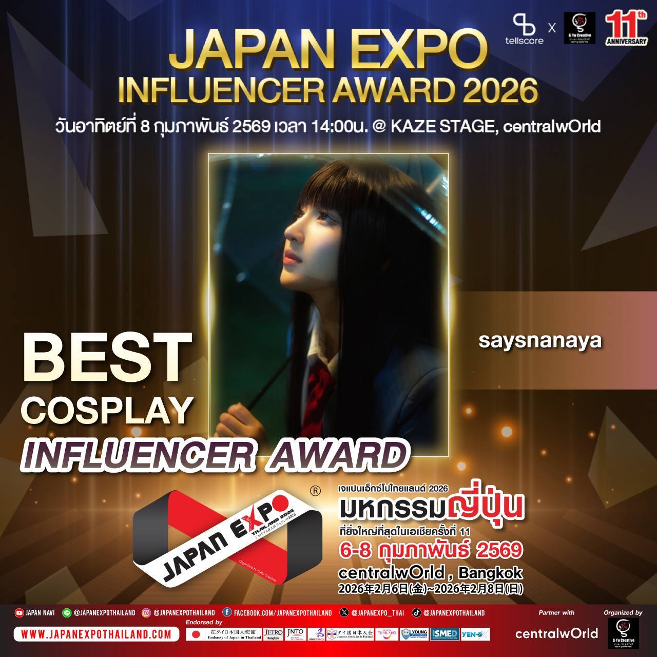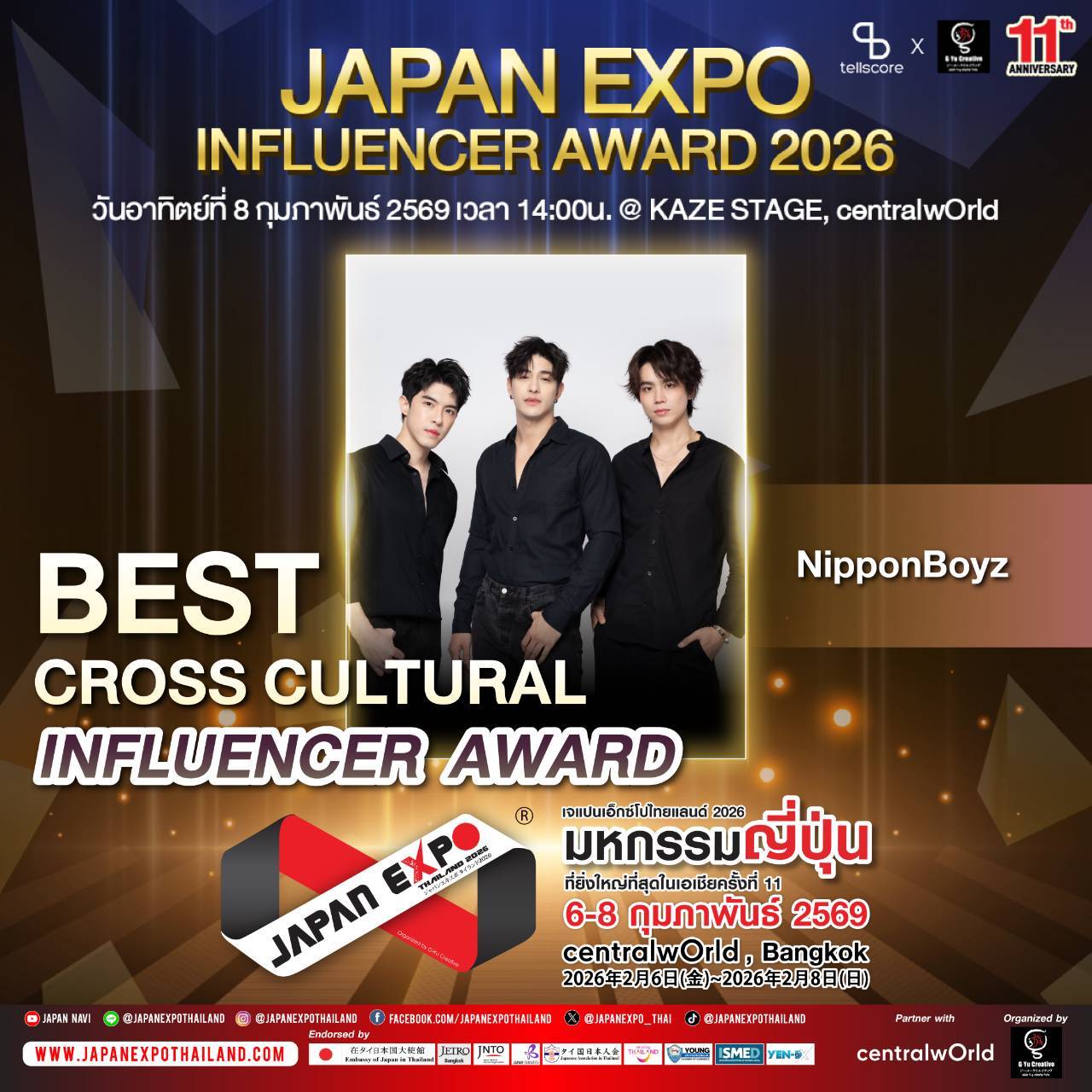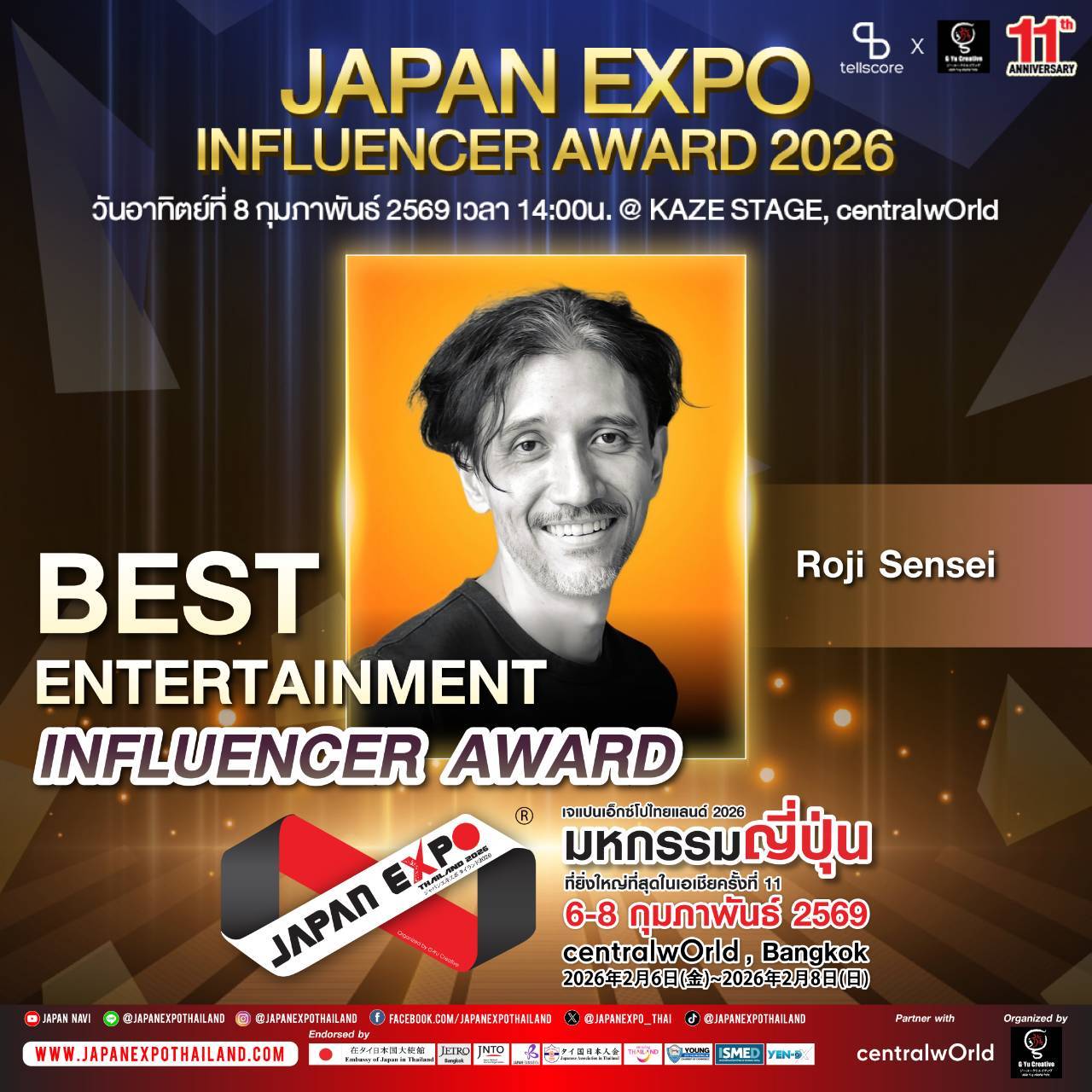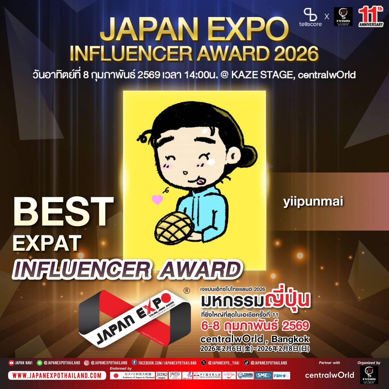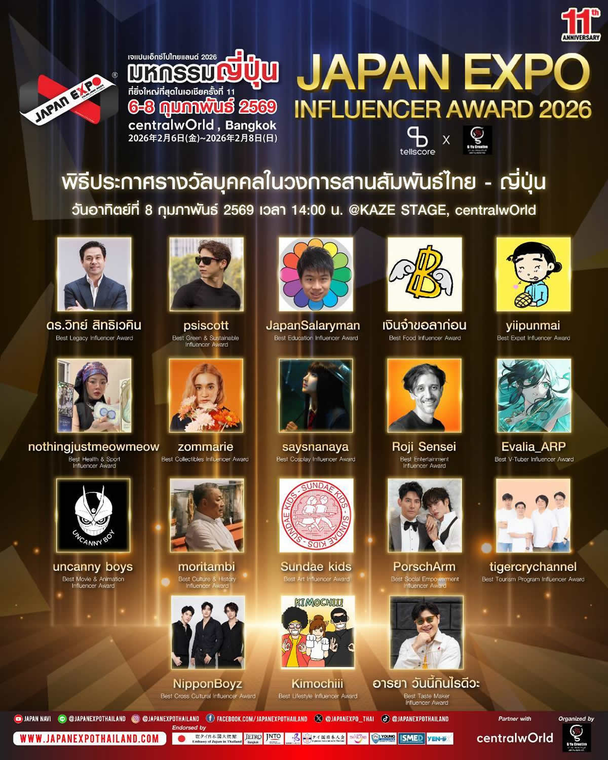 今回の表彰は、日タイのSoft Powerや文化的交流をさらに深めることを目的としており、ジャンルごとに活躍が認められたインフルエンサーが選出されました。授賞式は 「JAPAN EXPO THAILAND 2026」2026年2月8日(日)14:00〜14:45、CentralWorld(KAZE STAGE – ZONE B) にて開催されます。