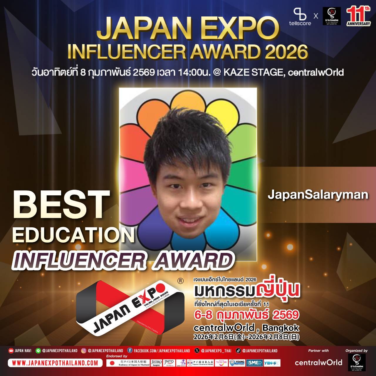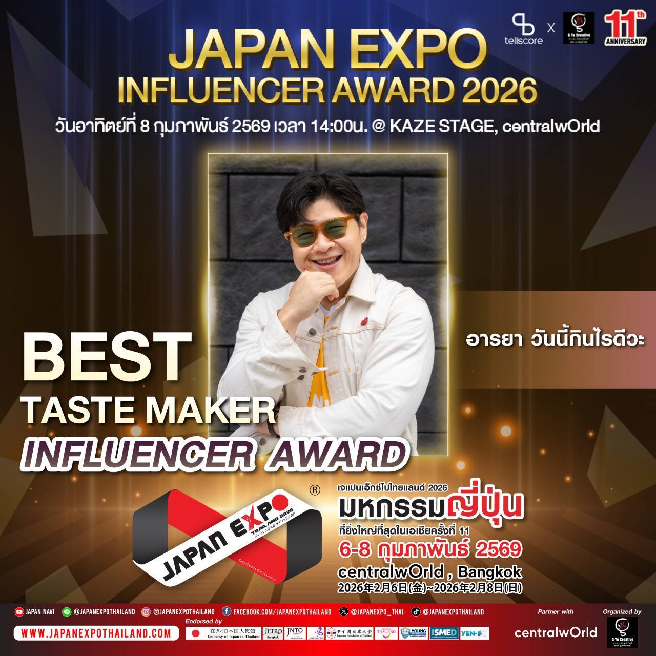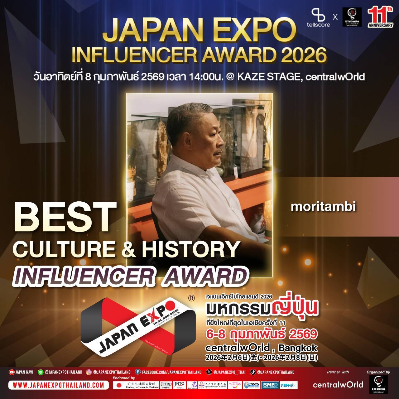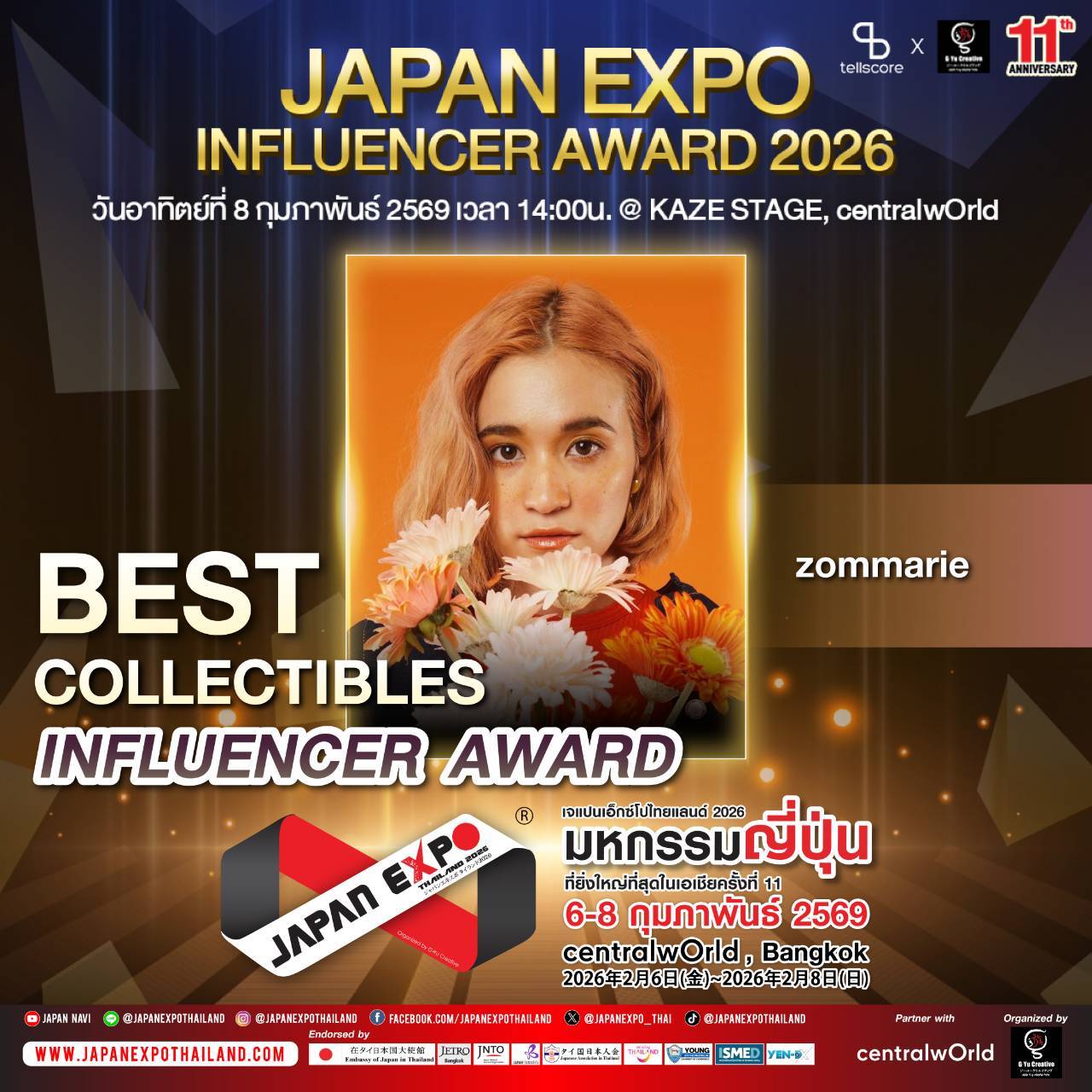 今回の表彰は、日タイのSoft Powerや文化的交流をさらに深めることを目的としており、ジャンルごとに活躍が認められたインフルエンサーが選出されました。授賞式は 「JAPAN EXPO THAILAND 2026」2026年2月8日(日)14:00〜14:45、CentralWorld(KAZE STAGE – ZONE B) にて開催されます。