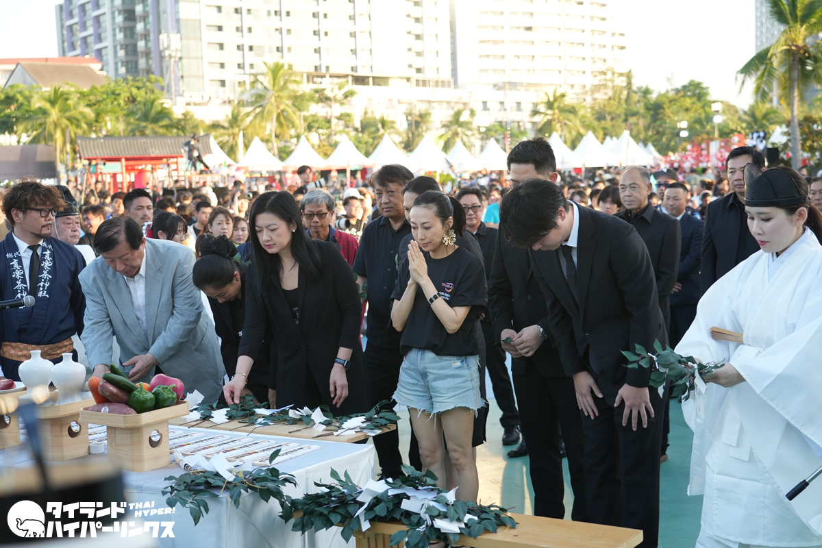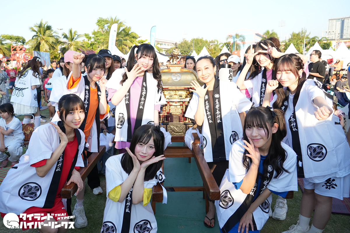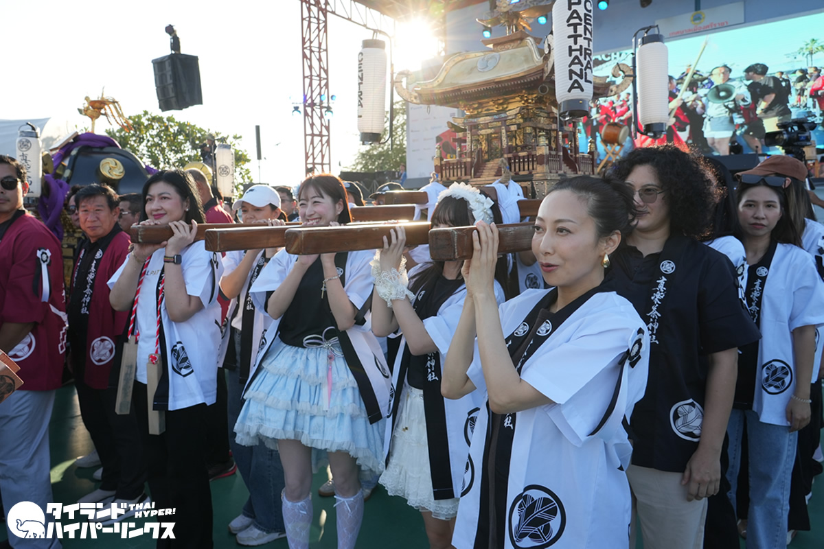 また初日には、真楽茶神社(シラチャ神社)のお神輿の御霊入れと開会式に参加。最終日には実際にお神輿を担ぎ、日タイの出演者とともに会場内を練り歩く姿も見られました。