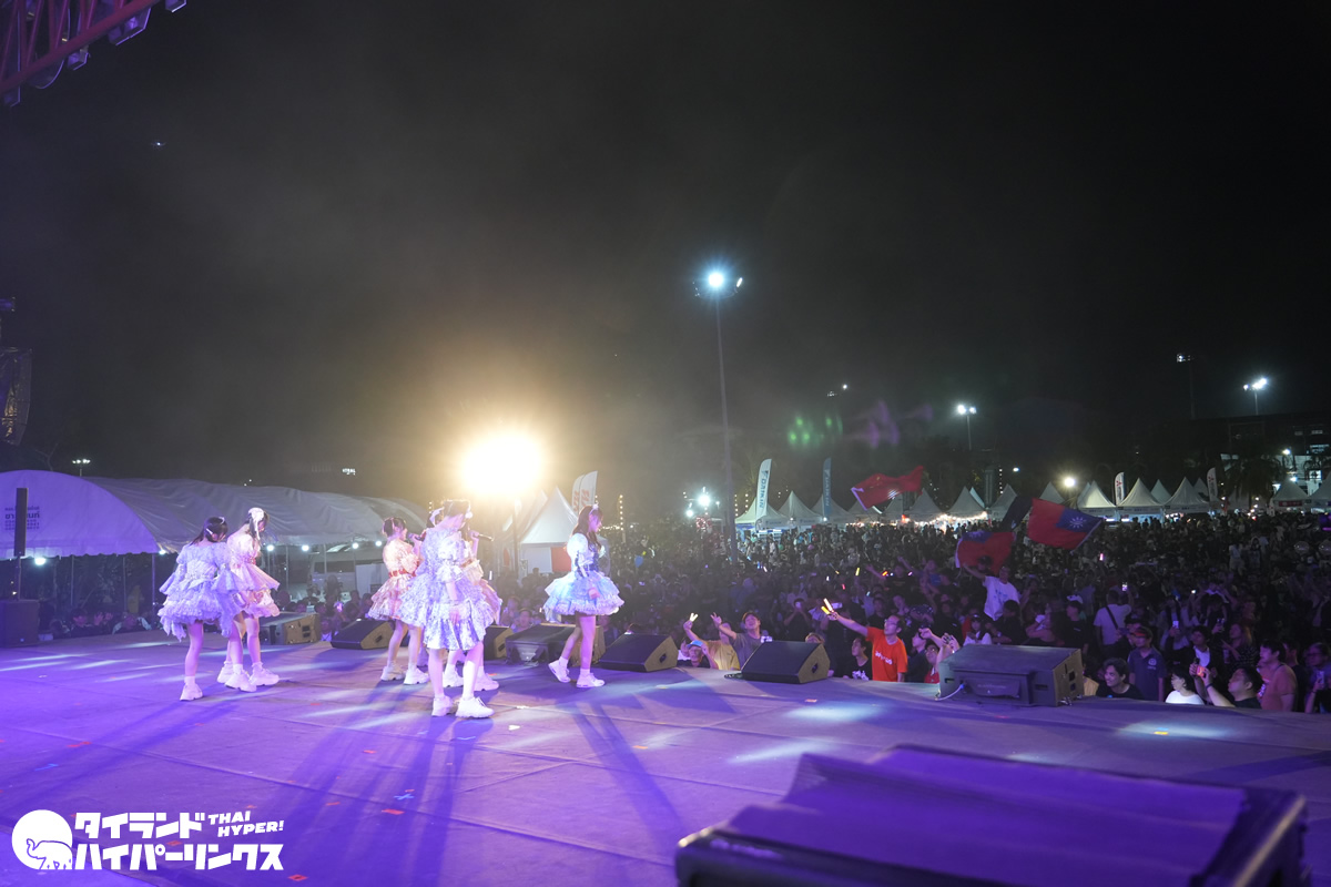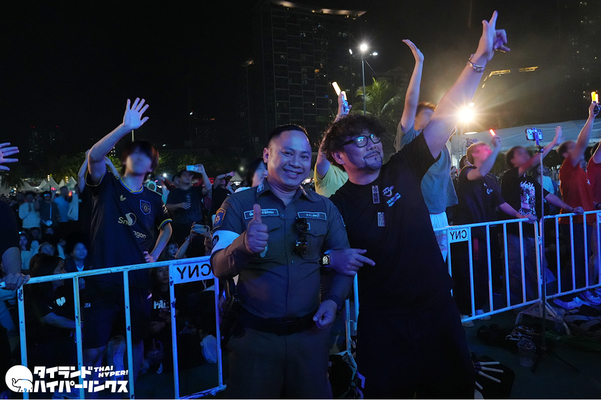 ステージ前には日本、タイをはじめ、世界の国々の国旗が振られ、まさに“国際的なアイドルフェス”の様相に。今回は日タイを含めて8つの国と地域からファンが集結したのだとか。ライブ中は、運営スタッフまでもが思わず踊り出してしまうほどの熱狂ぶりで、警察官も大興奮。シラチャ全体が明るい活気に包まれました。