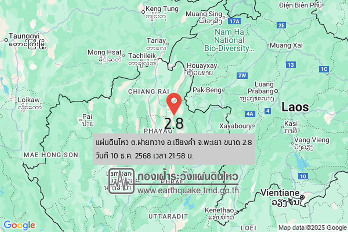 タイ気象局・地震監視センターは、2025年12月10日21時58分ごろ、パヤオ県チェンカム郡ファイクワン地区でマグニチュード2.8の地震が発生したと発表しました。