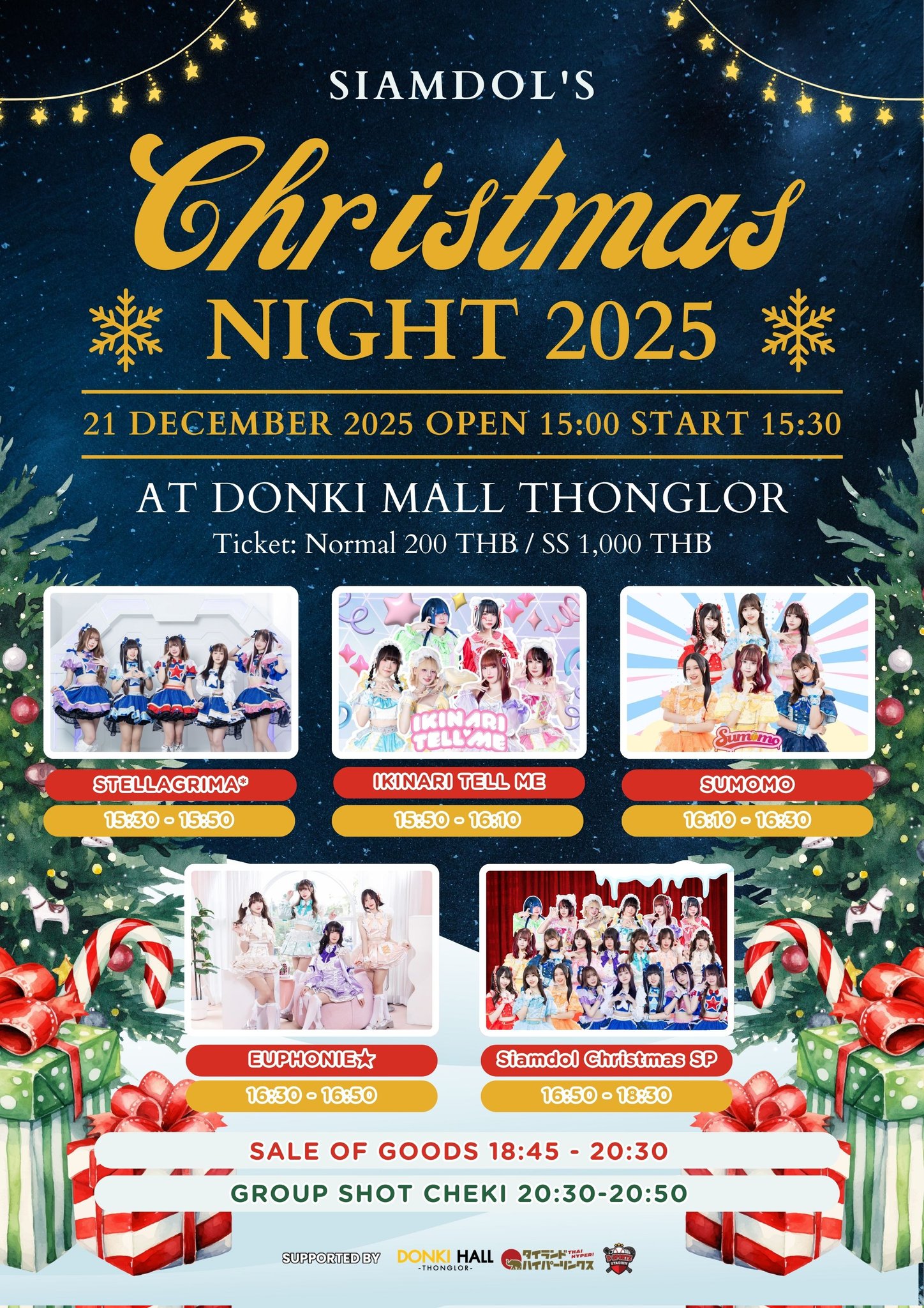 サイアムドルのアイドルグループ4組によるクリスマスライブイベント  Siamdol presents 『Christmas Night 2025』が、バンコクのドンキホール(ドンキモール・トンロー4階)で2025年12月21日(日)に開催されます。チケット価格は一般200バーツ、最前列SS席は1000バーツ。