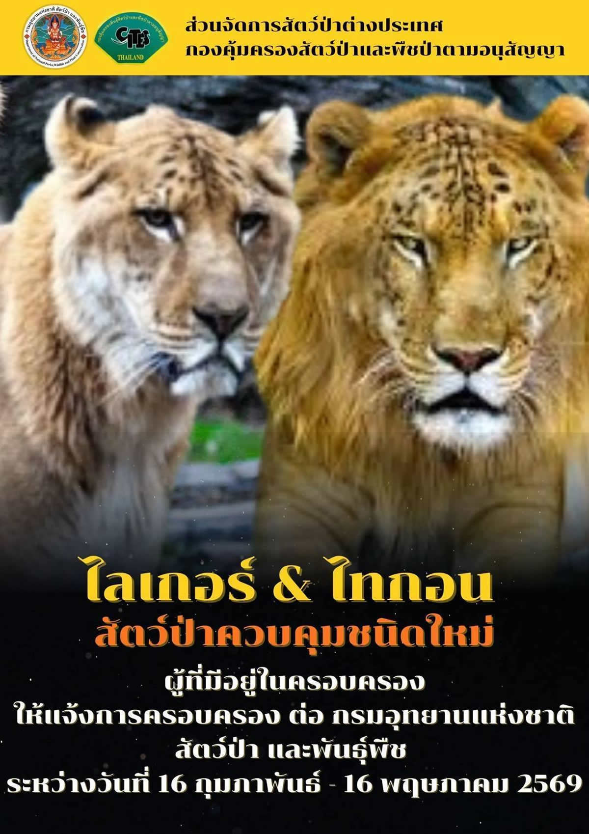 タイ天然資源環境省傘下の国立公園・野生動物・植物保全局は、ライオンとトラの交雑種である「ライガー(Liger)」および「タイゴン(Tigon)」を、新たに管理対象野生動物に指定し、飼育者に対して届け出を義務付けると発表しました。