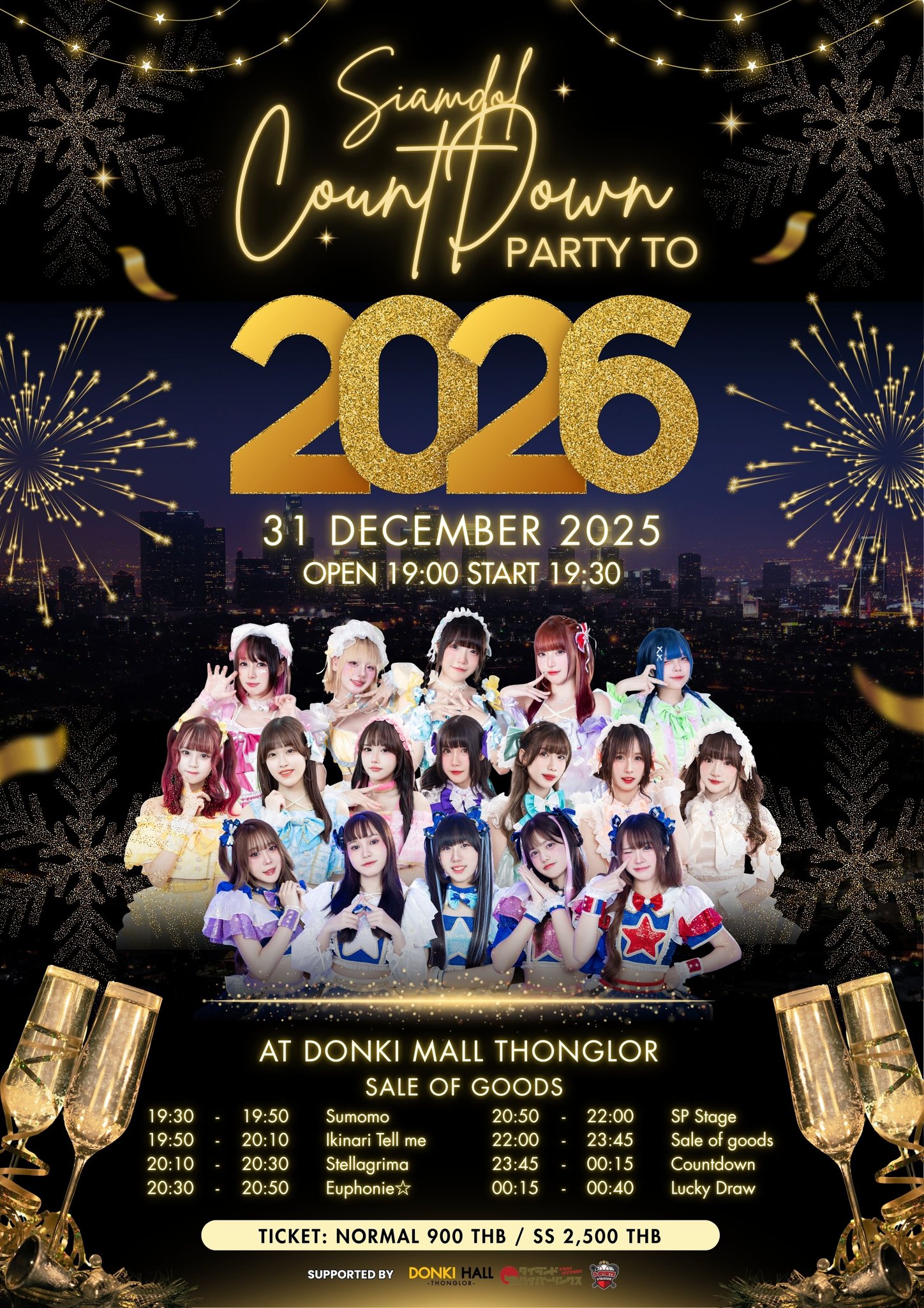 2025年大晦日の夜のアイドルライブ Siamdol presents『Countdown Party to 2026』が、バンコクのドンキホール(ドンキモール・トンロー4階)で開催されます。カウントダウンやラッキードローも実施されます。チケットは一般900バーツ、SS席2500バーツ。撮影は禁止。