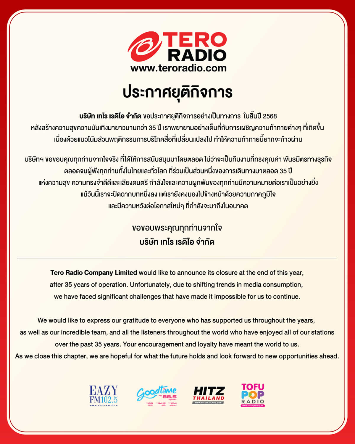 タイのラジオ放送事業者 TERO RADIO は、2025年末をもって事業を終了すると発表しました。35年にわたり音楽とエンターテインメントを発信してきたラジオ局が、その歴史に幕を下ろします。