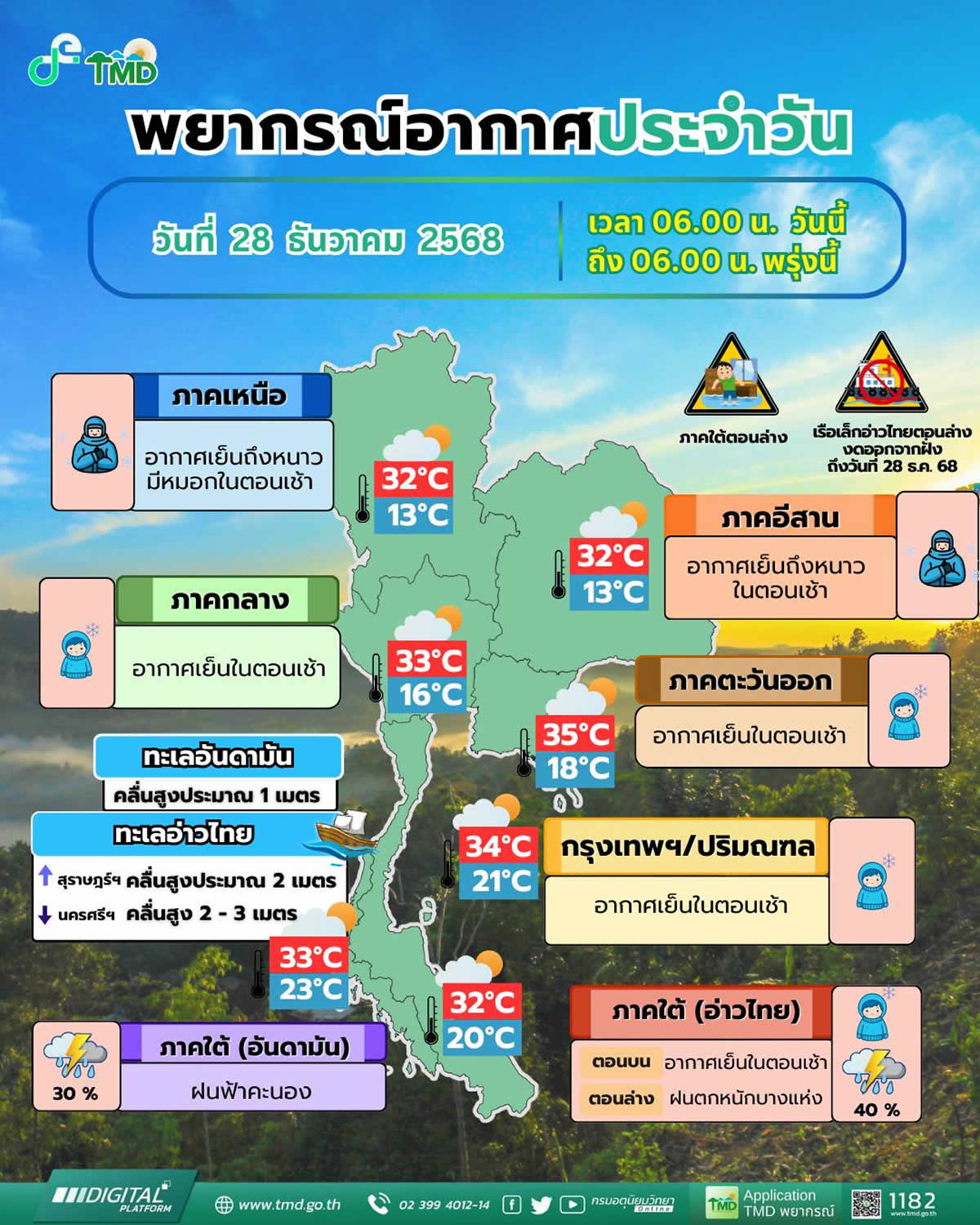 タイ気象局によると、2025年12月28日(日)は、やや強い北東モンスーンの影響で、タイ湾・南部・アンダマン海では不安定な天候が続く見込みです。特に南部下部では雷雨や局地的に激しい雨が予想され、山沿いや低地、河川沿いでは増水や冠水、鉄砲水への警戒が必要とされています。