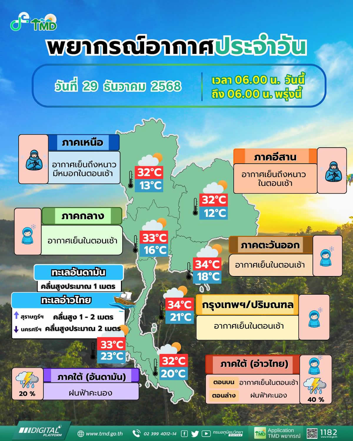 タイ気象局によると、2025年12月29日(月)は、やや強い北東モンスーンの勢力が次第に弱まり、南部下部では雨の範囲は縮小する見込みです。ただし、南部下部では引き続き局地的に雷雨が発生する可能性があり、注意が必要とされています。