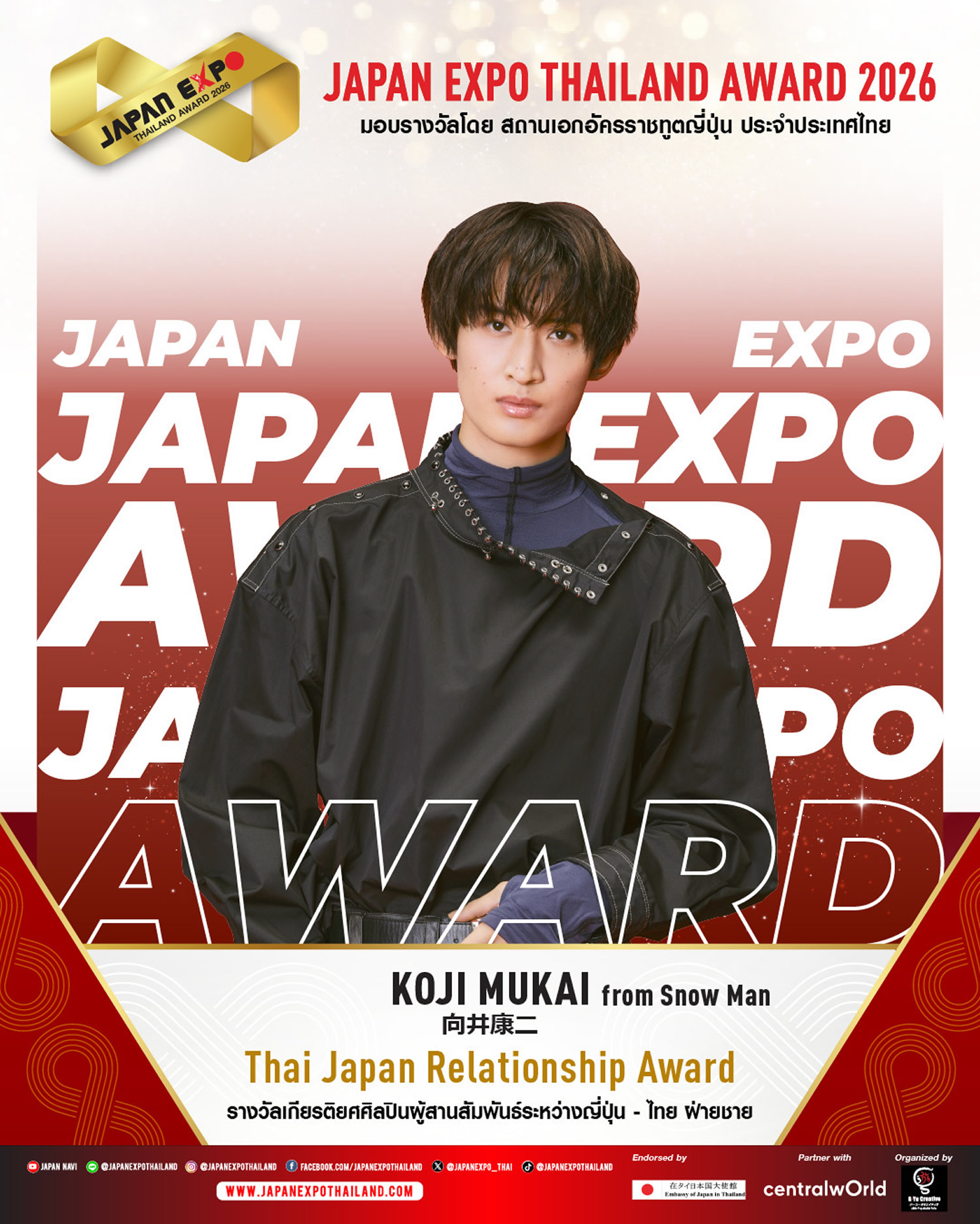Snow Manの向井康二さんが、JAPAN EXPO THAILAND AWARD 2026において「THAI JAPAN RELATIONSHIP AWARD(日タイ関係功労賞)」を受賞することが発表されました。