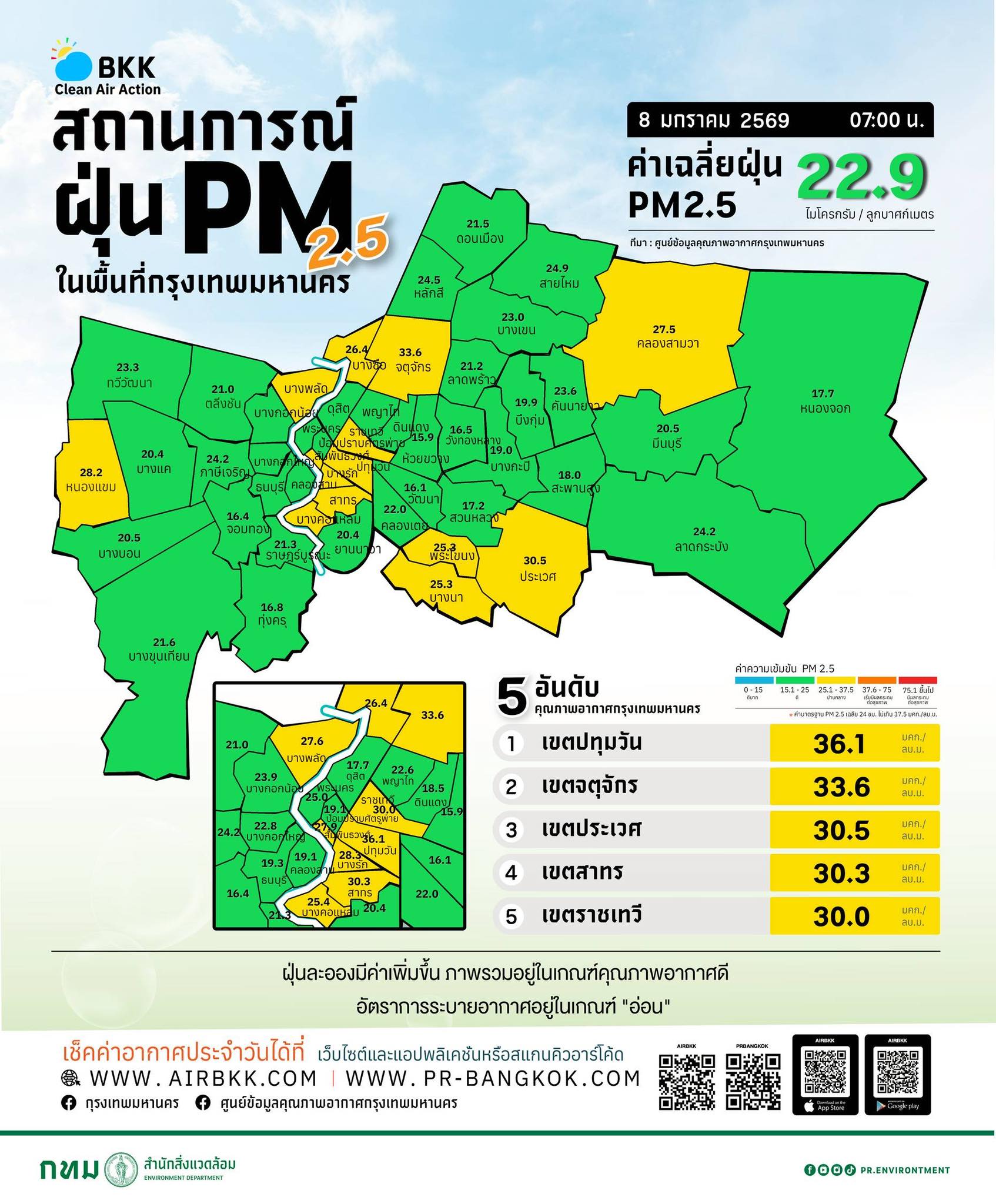 バンコク都庁は2026年1月8日(木)朝、バンコク都の大気汚染状況を発表しました。午前7時時点のPM2.5(微小粒子状物質)の都全体平均値は22.9μg/㎥で、基準値(37.5μg/㎥)を下回りました。都内の空気質は「良好」とされています。