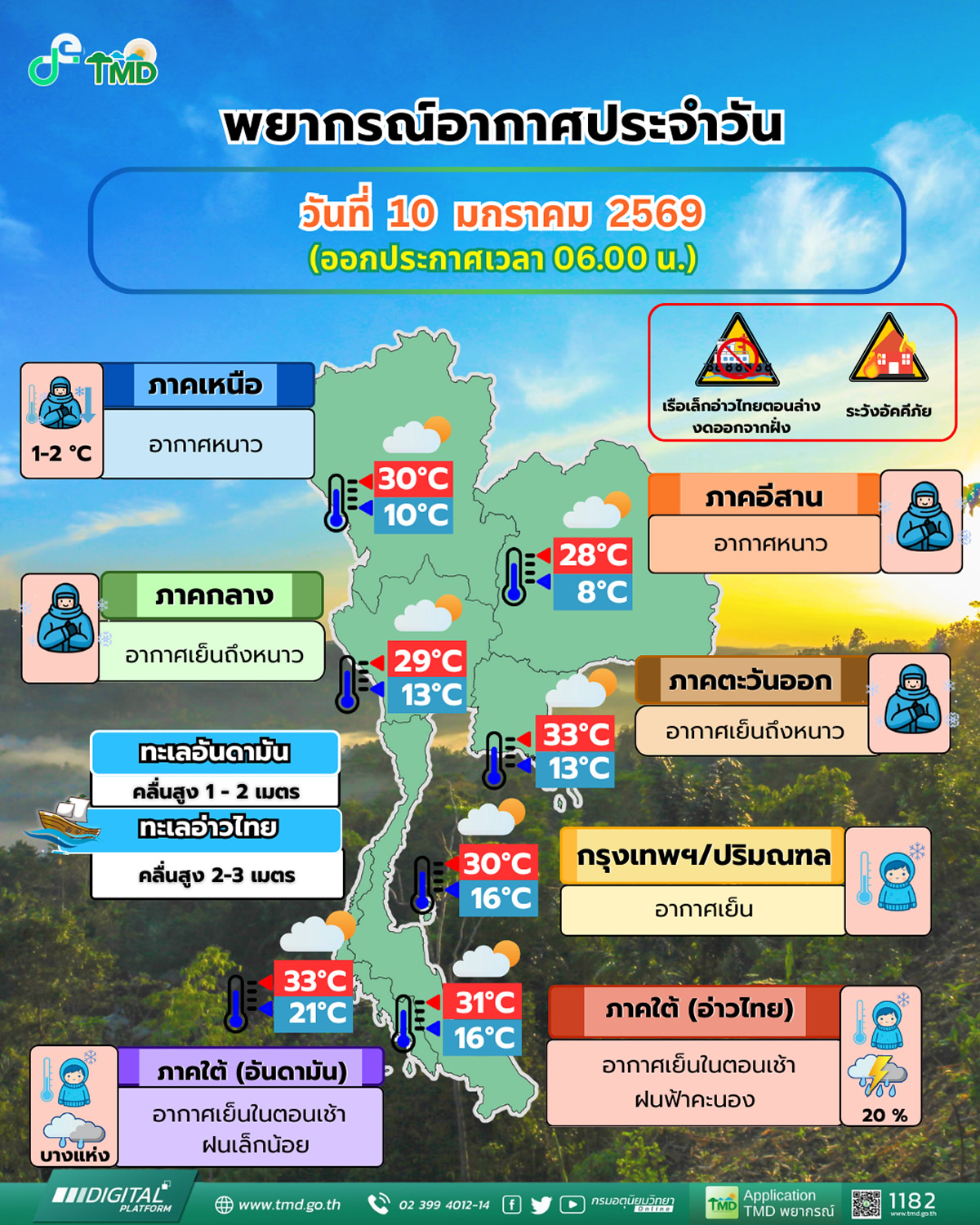 タイ気象局によると、2026年1月10日(土)は、中国からの強い高気圧が引き続き上部タイを覆い、北部・東北部・中部を中心に涼しいから寒い天気が続く見込みです。乾いた空気と北東風の影響で、朝晩は特に冷え込み、山間部では霜が発生するおそれがあります。