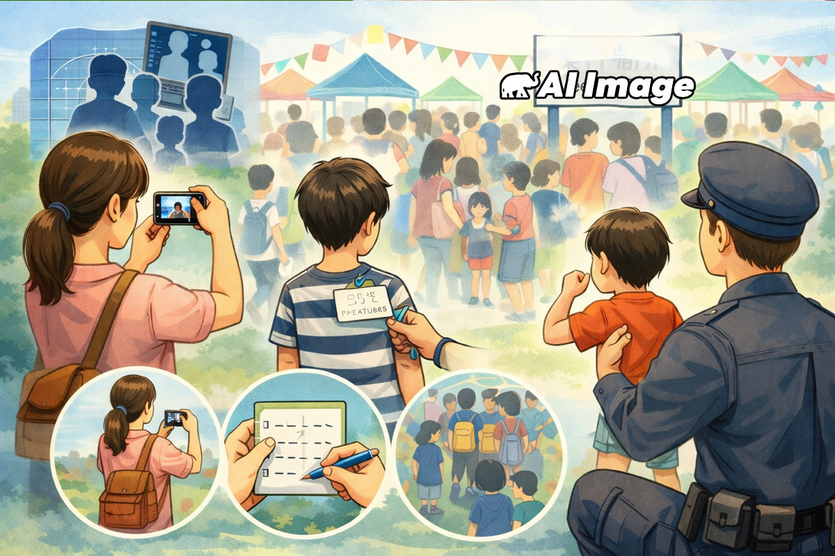 公共のイベントに子どもを連れて参加する際には、迷子やはぐれを防ぐための対策を取るよう求めています。具体的には、子どもの身体的特徴を事前に把握しておくこと、当日着ている服装と同じ格好で最近撮影した写真を用意すること、連絡先を記した名札を持たせること、そして万が一離れた場合に集合する場所を決めておくことなどが挙げられています。