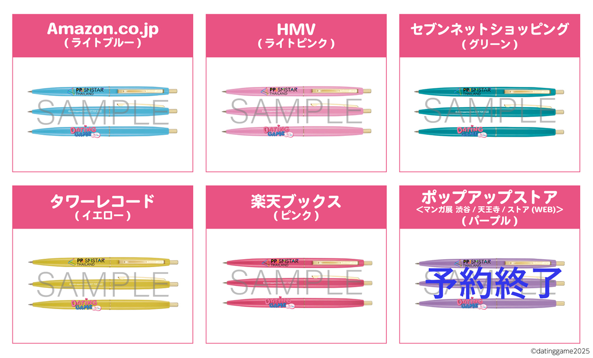 Amazon.co.jp(ライトブルー)/HMV(ライトピンク)/セブンネットショッピング(グリーン)/タワーレコード(イエロー)/