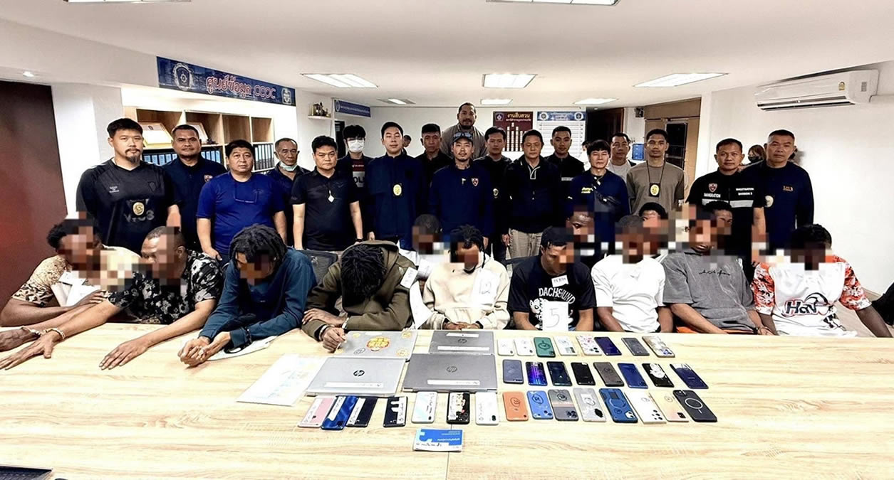 情報を受け、入国管理局と第1管区警察の幹部は合同捜査を指示。2026年1月19日午後1時ごろ、被害者とやり取りが活発になる時間帯を狙い、警察が一斉にコンドミニアムを捜索しました。室内では被害者とチャット中の容疑者も確認され、一部は逃走を図りましたが、建物外で待機していた警察官が全員を確保しました。