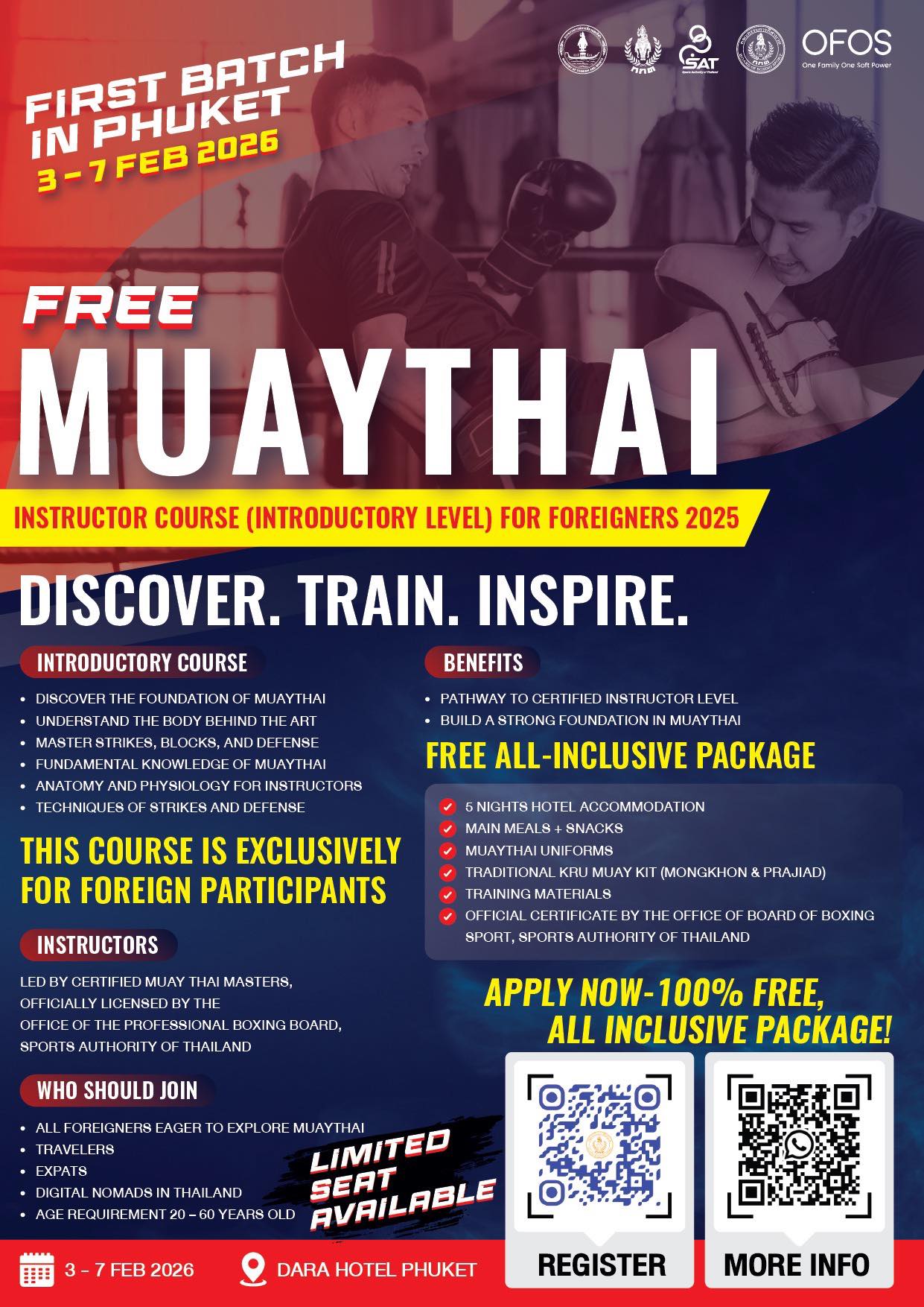 タイ・スポーツ庁は、国家ソフトパワー戦略委員会事務局と連携し、外国人を対象とした「ムエタイ指導者向け基礎トレーニング講座」を無料で実施すると発表しました。第1回講座は、2月3日から7日までの5日間、プーケット県で開催されます。