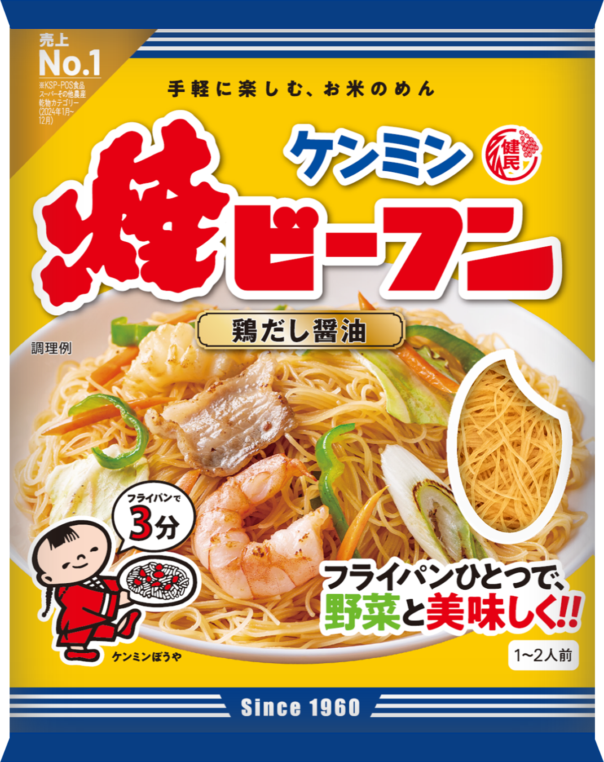 1960年に発売された「ケンミン焼ビーフン」は、ビーフンに馴染みのなかった家庭でも調理しやすいよう、鶏だしを効かせた醤油味で開発されました。下ゆでや特別な調味料を必要とせず、フライパンひとつで調理できる点が特徴とされています。現在は年間約1800万食が製造・販売されており、2020年には「最も長く販売されている即席焼ビーフンブランド」としてギネス世界記録に認定されています。