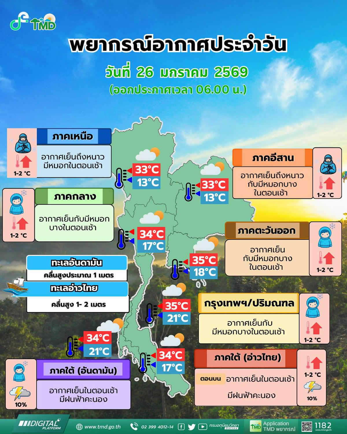 タイ気象局によると、2026年1月26日(月)は、上部タイと南部上部を覆っているやや強い高気圧が次第に弱まり、各地で朝は涼しく、所により霧が出る見込みです。北部・東北部では引き続き冷え込んだ朝となり、山地では霜の降りる可能性があります。