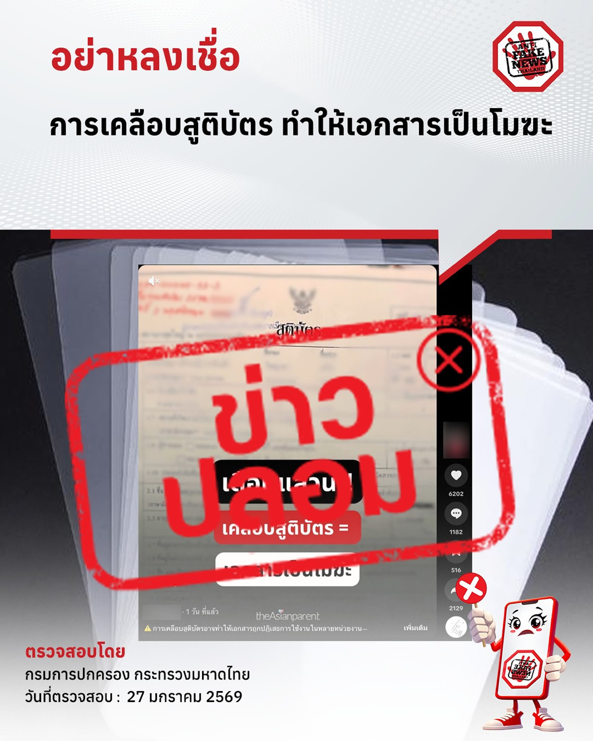 タイ政府の反フェイクニュース対策機関「Anti-Fake News Center Thailand」は2026年1月27日、出生証明書(สูติบัตร)をラミネート加工すると無効になるという情報は事実ではないと発表しました。