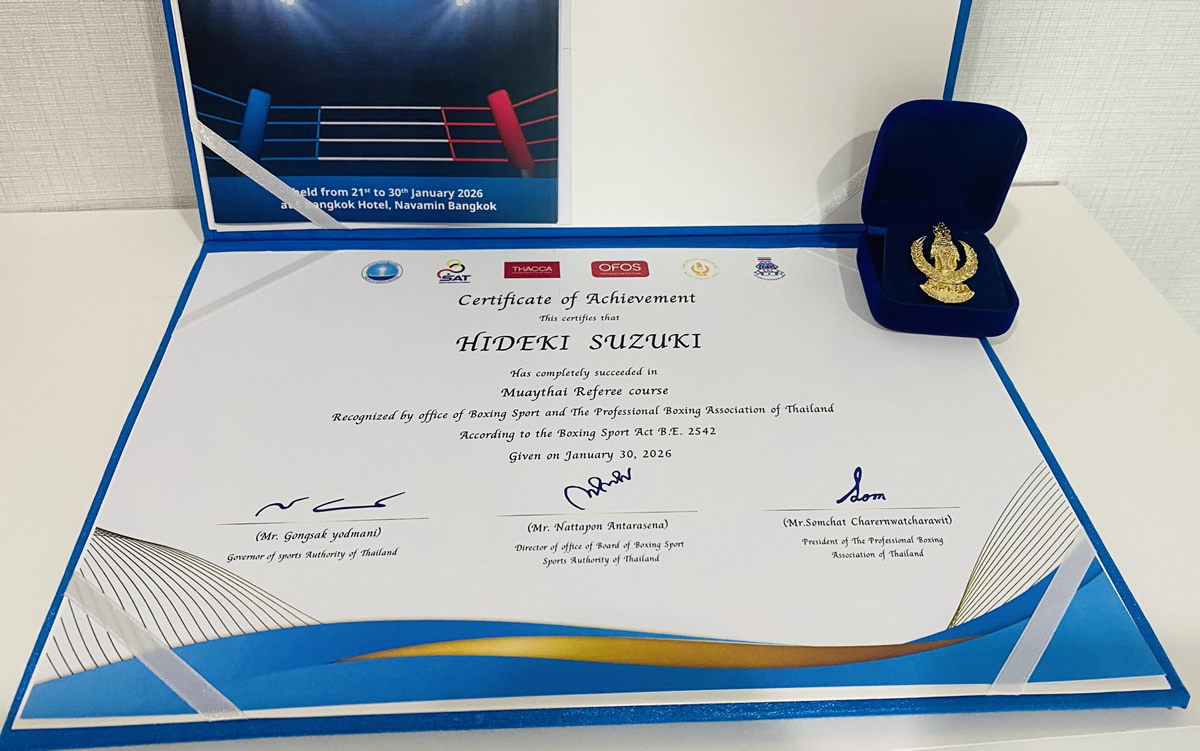 2026年1月21日から30日までの10日間、タイ・バンコクにて、タイ国観光・スポーツ省、タイ国スポーツ局(SAT)、タイ国ムエスポーツ委員会、タイ国プロムエタイ協会(PAT)共催による、外国人を対象としたプロフェッショナルムエタイ競技レフェリー講習会が開催されました。