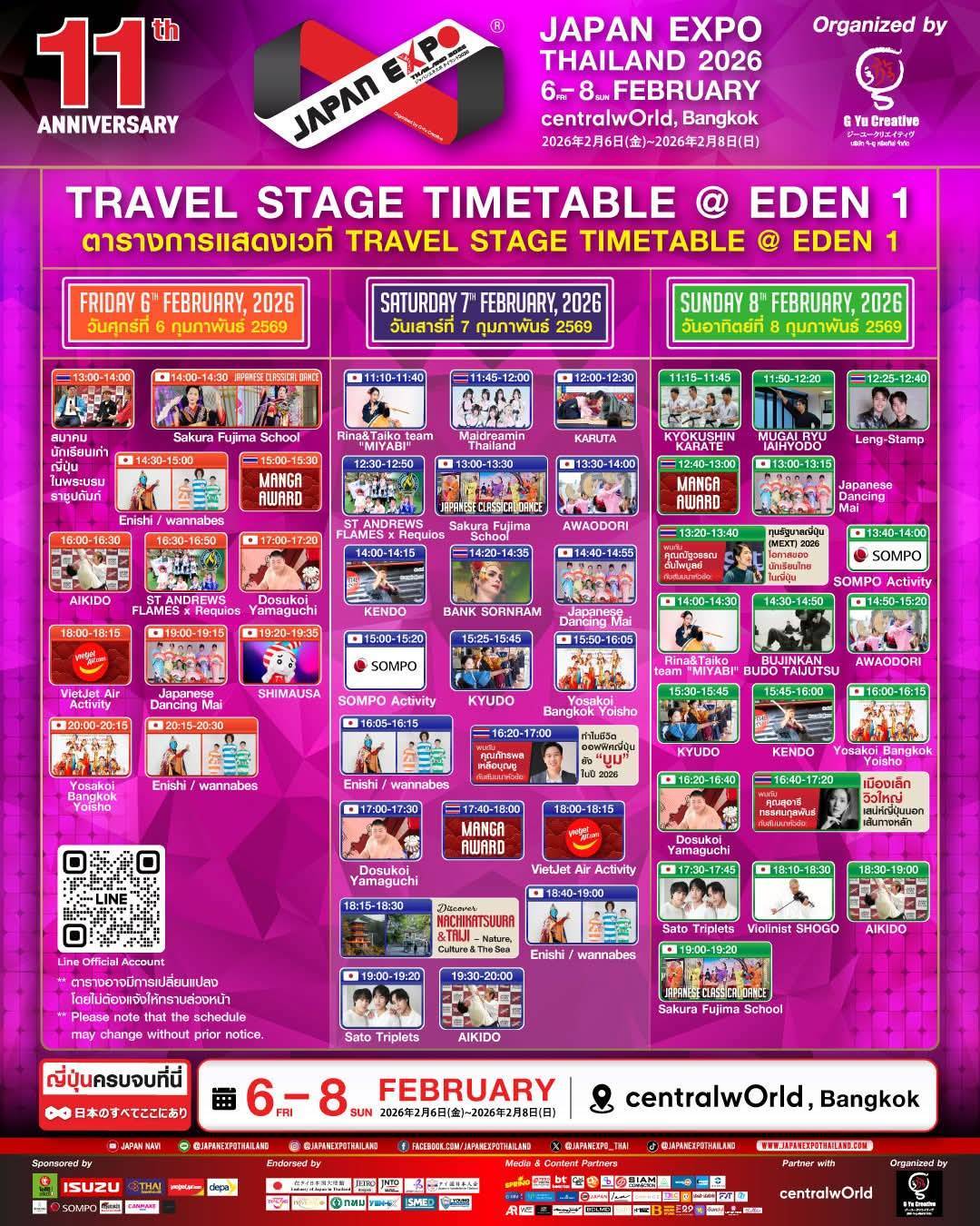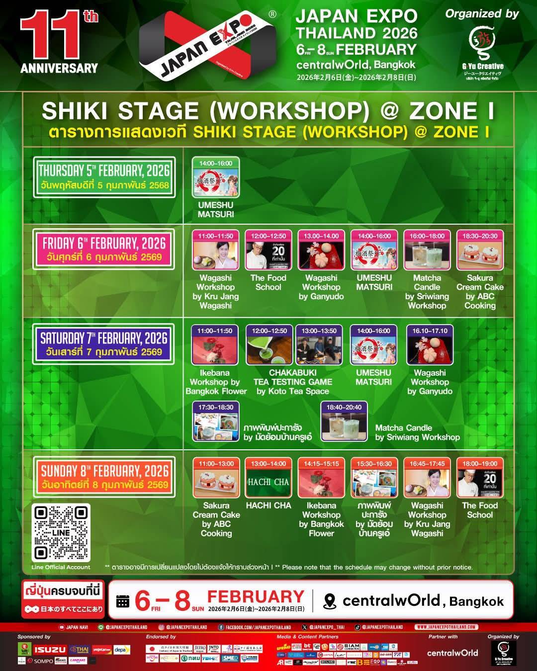 コスプレパレードやパフォーマンス、ロリータファッションの「Dollita Parade」、キャラクター・VTuber・IPゾーンをはじめ、「Taste of Japan」フードゾーン、旅行・県別観光ゾーン、Study in Japan Fair、ビジネスゾーン、アート&クラフトワークショップ、日泰融合ファッションショー「MUGEN STYLE COLLECTION x SORAPOL」など、多彩な企画が3日間にわたり展開されます。