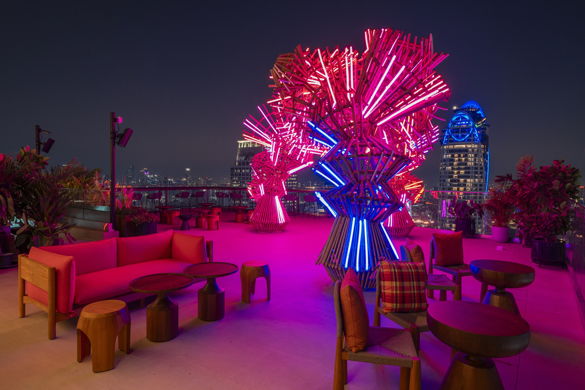 タイ初、アジア太平洋地域最大規模のモクシーホテルとして位置付けられる同ホテルの32階にある「Sato San Rooftop Bar」は、360度のパノラマビューを備え、ネオンが印象的な屋内ラウンジと開放的な屋外テラスを組み合わせたルーフトップ空間です。日本の繊細さとタイ・イサーンの楽しさを融合させたコンセプトで設計され、カジュアルな集まりから大型イベントまで対応可能です。