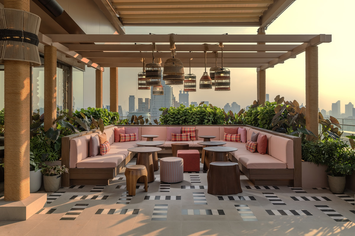 モクシー・バンコク・ラチャプラソンはラチャプラソン地区中心部に位置し、セントラルワールド至近、BTSチットロム駅からもアクセス良好。Sato San Rooftop Barは毎日18時から翌2時まで営業し、20歳以上が利用可能です。