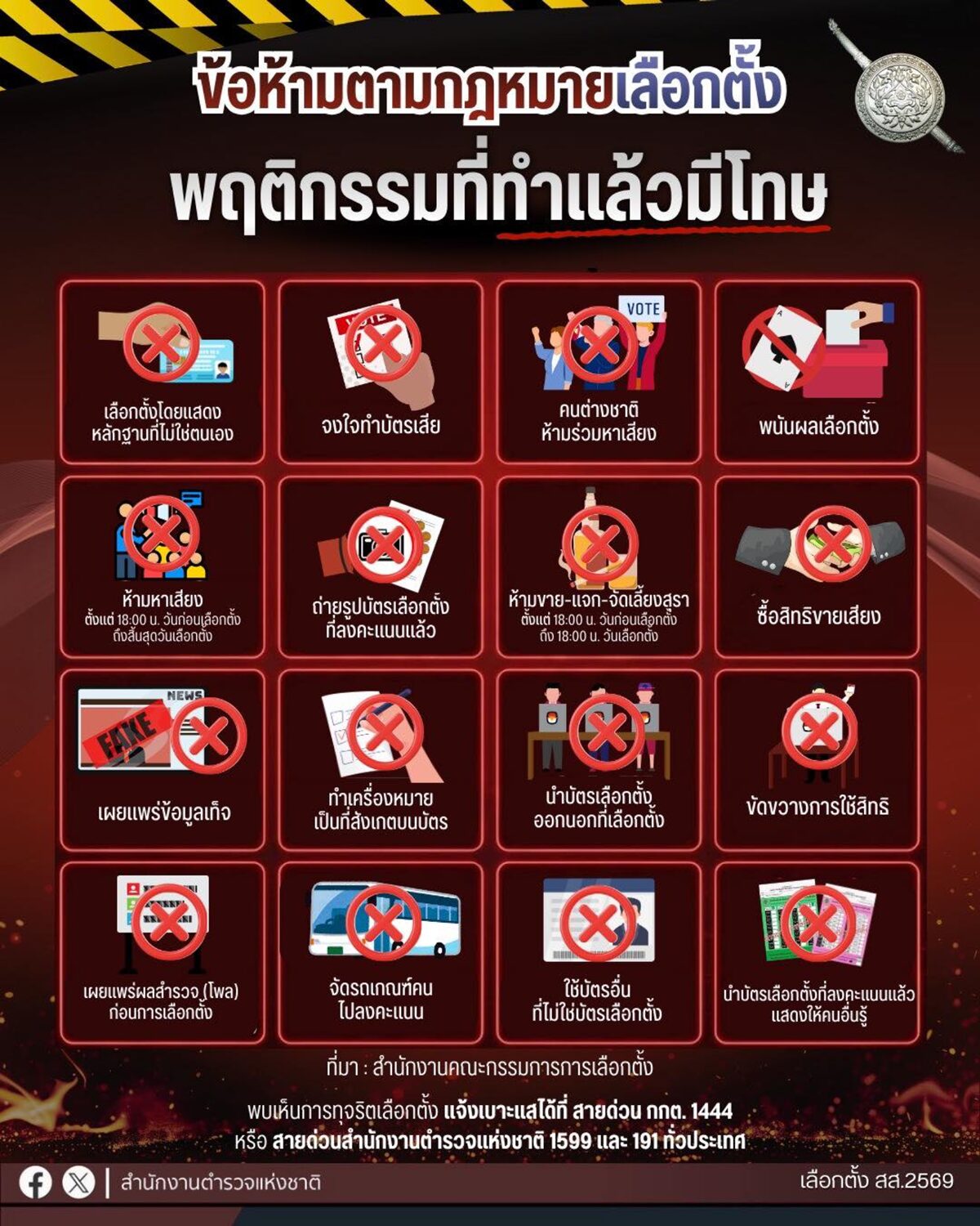 タイ警察は、選挙に関する違反や不正を発見した場合、関係機関への通報を求めるとともに、法令を遵守して選挙に参加するよう呼びかけています。