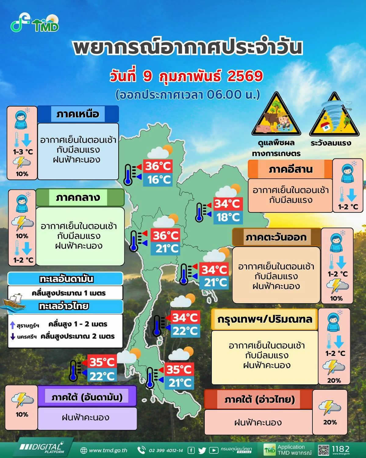 タイ気象局によると、2026年2月9日(月)は、中国からのやや強い高気圧が上空を覆い、全国的に天候が変わりやすくなる見込みです。初めは湿った空気の流入により各地で雷雨の可能性があり、その後は強風とともに気温が低下する予想です。特に東北部では2〜4℃の気温低下が見込まれ、中部や東部、バンコク首都圏でも1〜2℃ほど下がる見通しです。