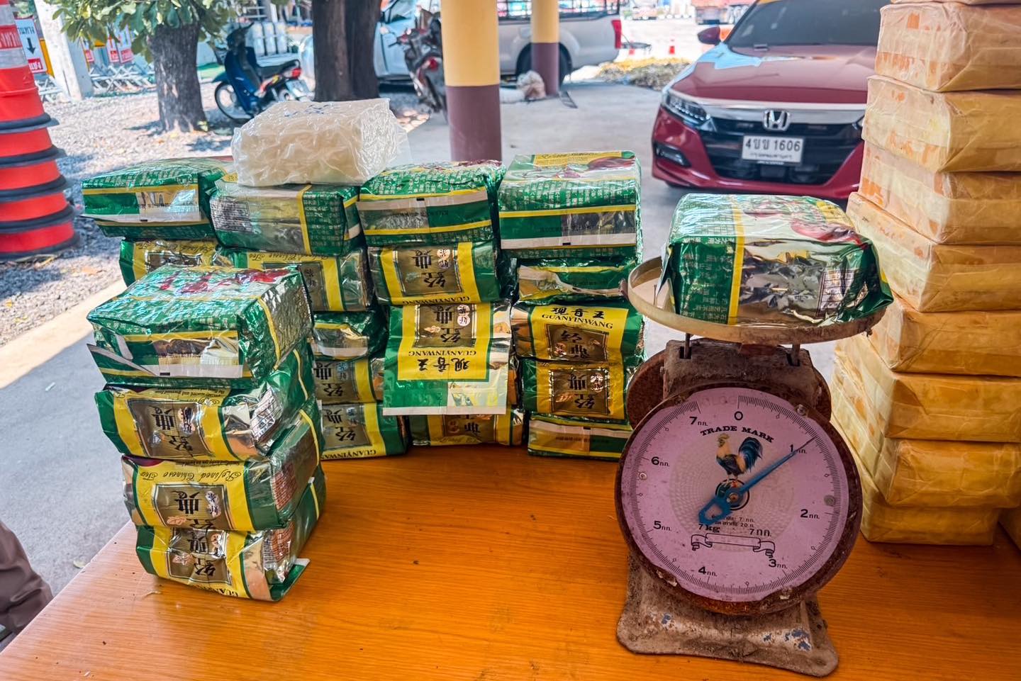 運転していた容疑者は当初、スコータイ県からニンニクを運んでいると説明しましたが、詳細な調査の結果、ニンニクの山の下から緑色の袋やリュックが見つかり、内部から大量の薬物が発見されました。車両1台と携帯電話1台も押収されています。