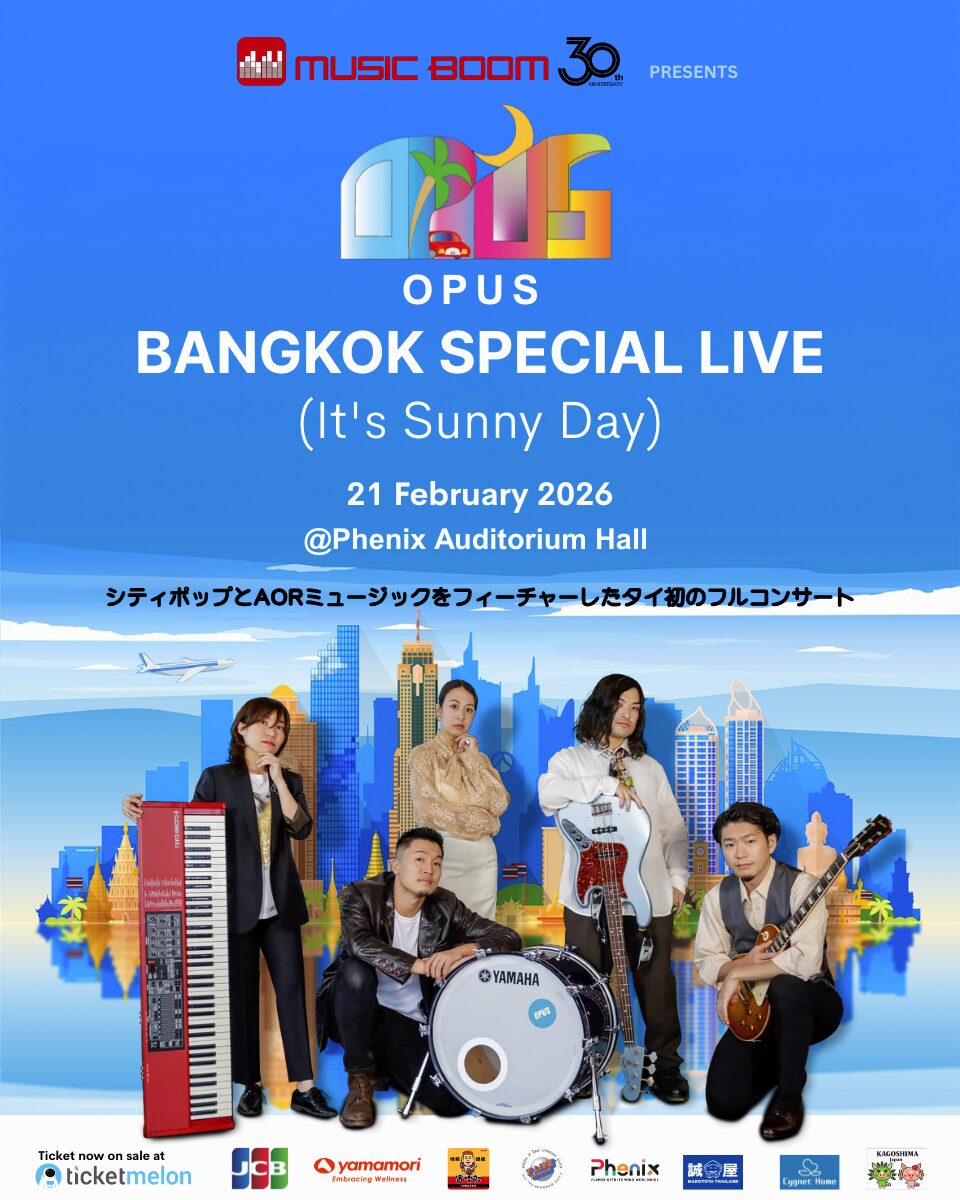日本のシティポップ/AORバンド「OPUS(オーパス)」によるバンコク公演「OPUS BANGKOK SPECIAL LIVE(It’s Sunny Day)」が、2026年2月21日(土)17時より、フェニックスプラザ内 Phenix Auditorium Hall にて開催されます。主催は音楽イベント制作会社 MUSIC BOOMです。