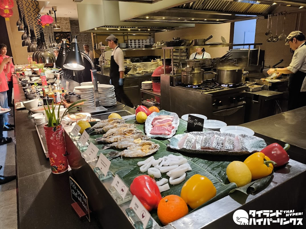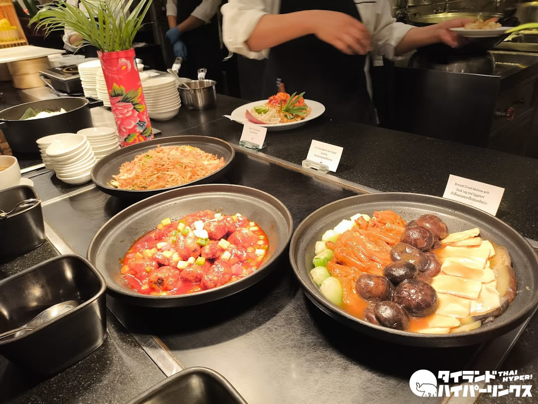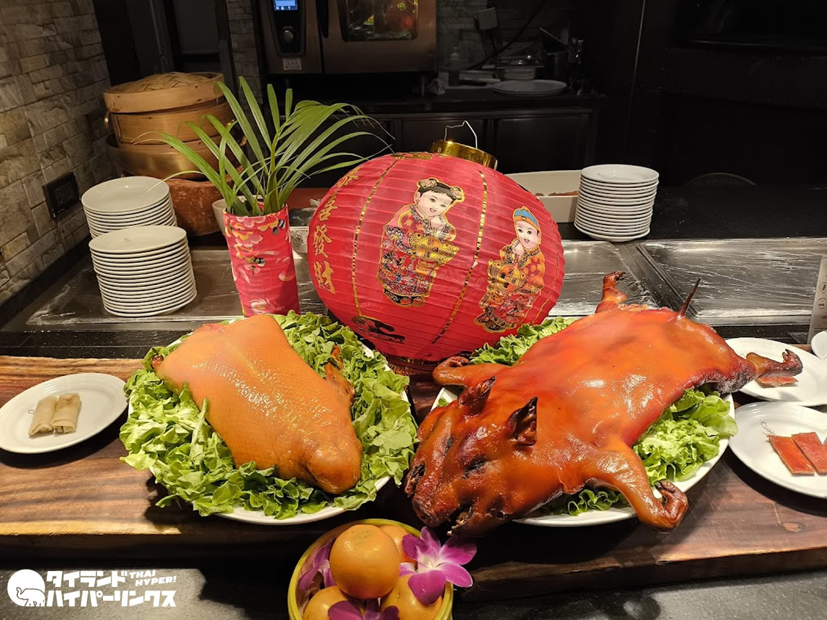 ディナービュッフェは期間限定で1人1,990バーツ(税・サービス料込み)。2月22日には、特別メニューを楽しめるサンデーブランチビュッフェ(1人2,490バーツ)も用意されています。 北京ダッグやアワビ、鱈、などの中華料理の他、和牛のステーキや各種シーフード、生牡蠣や寿司、刺し身まで盛りだくさんの内容です。