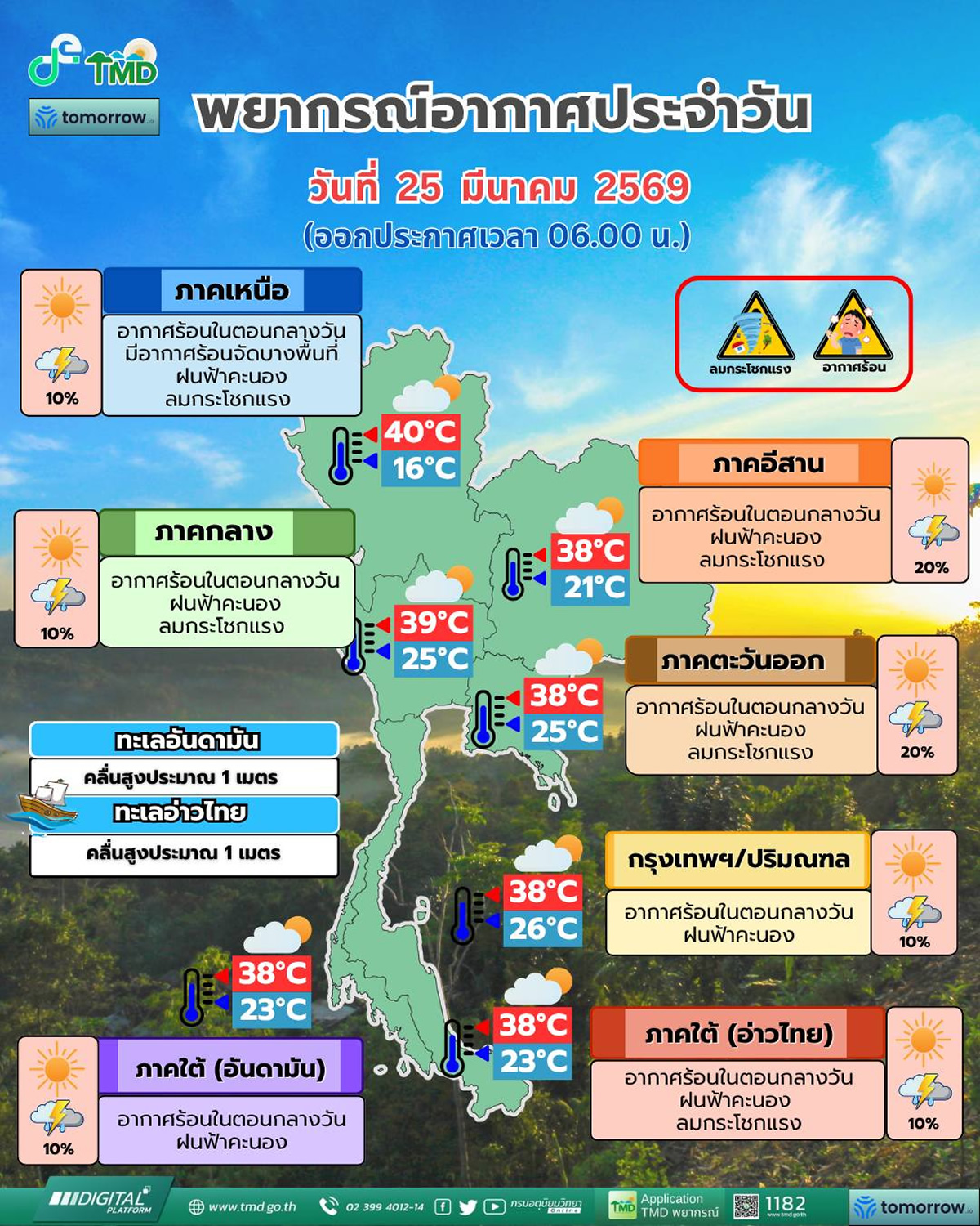 タイ気象局によると、2026年3月25日(水)は、上部タイを熱低気圧が覆い、全国的に厳しい暑さとなり、特に北部では40℃に迫る非常に暑い天気が続く見込みです。一方で、南〜南東の風が湿った空気を運び込む影響で、上部タイでは所により雷雨や突風を伴う不安定な天気となる可能性があります。