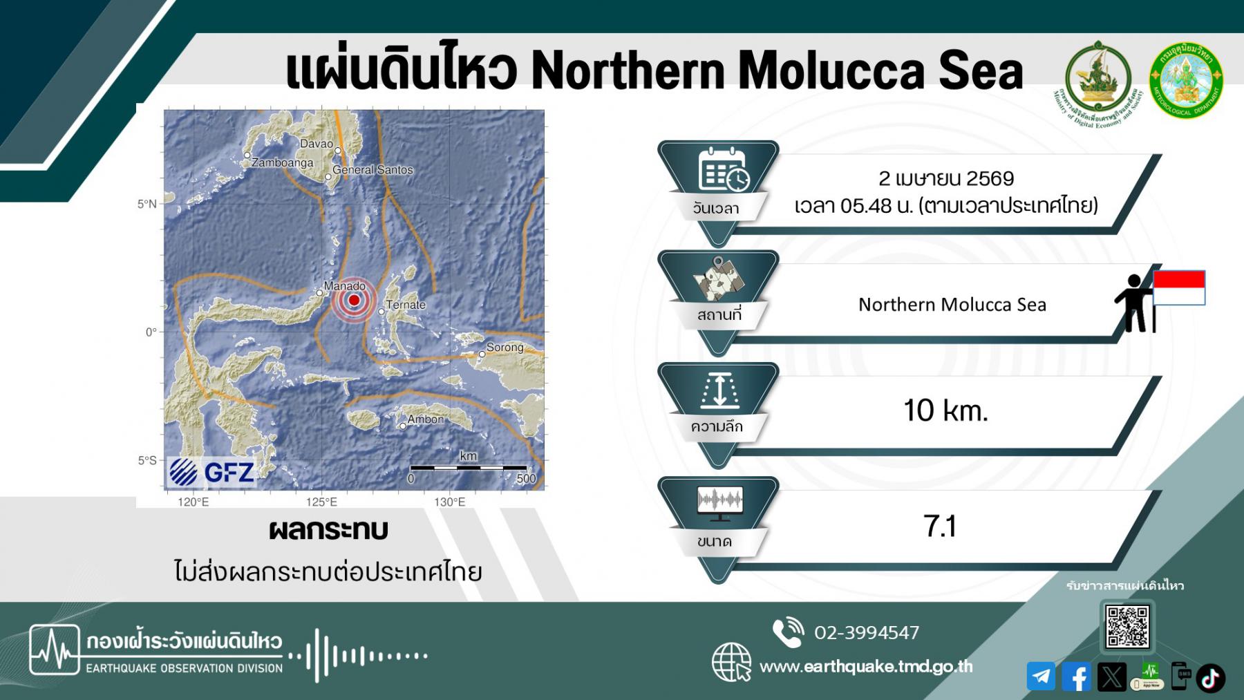 タイ気象局・地震監視部は、2026年4月2日午前5時48分(タイ時間)、インドネシア付近のモルッカ海でマグニチュード7.1の地震が発生したと発表しました。