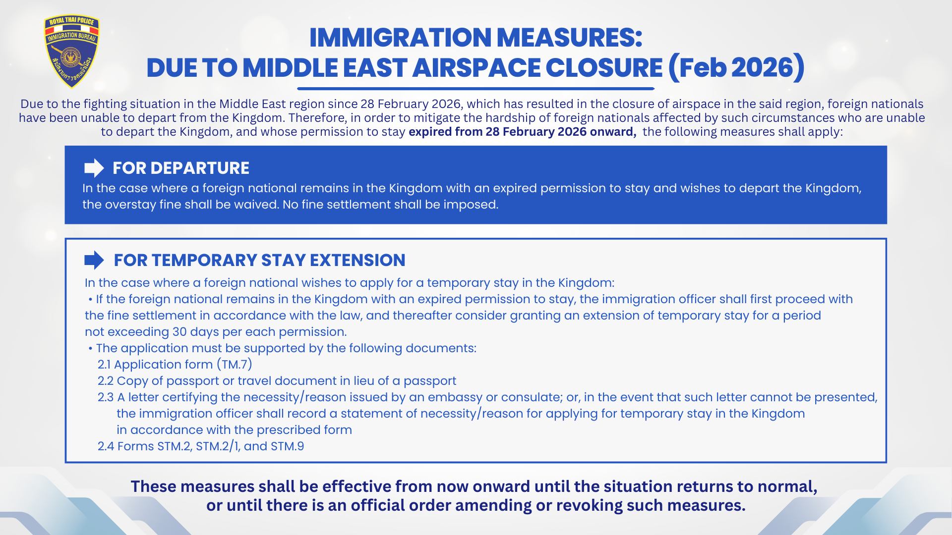 タイ入国管理局は2026年3月3日、中東地域での戦闘の影響により出国できなくなった外国人に対する特別措置を発表しました。