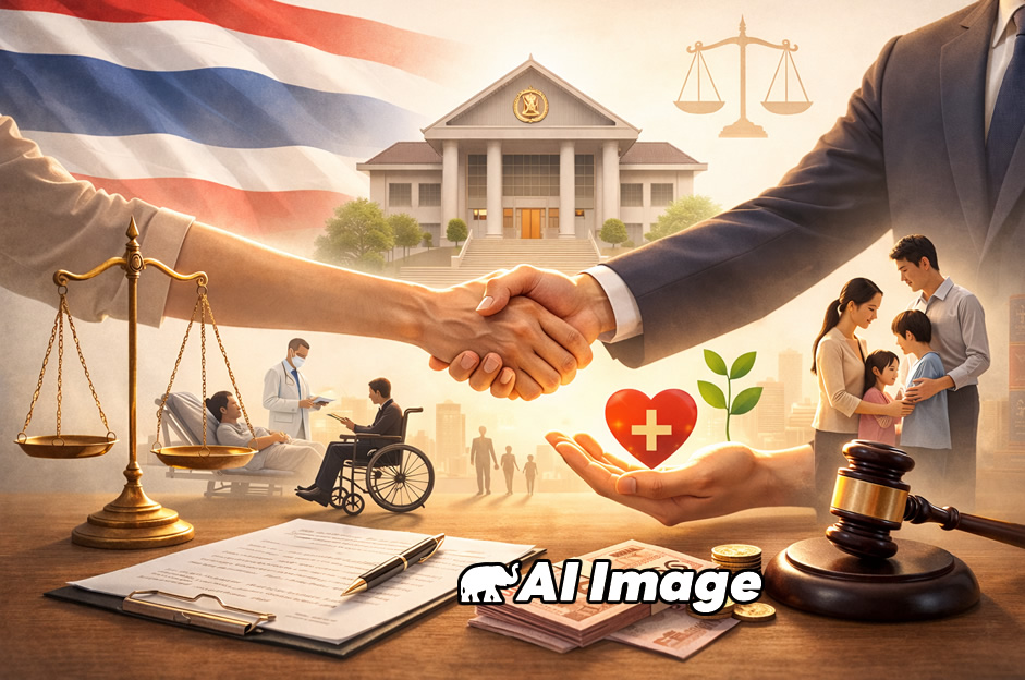 さらに、この制度は刑事訴追を受けたものの、裁判で無罪となった被告にも適用されます。訴追の過程で被告が死亡した場合は最大30万バーツ、生存している場合は医療費が最大8万バーツ、リハビリ費用が最大5万バーツまで補償されます。