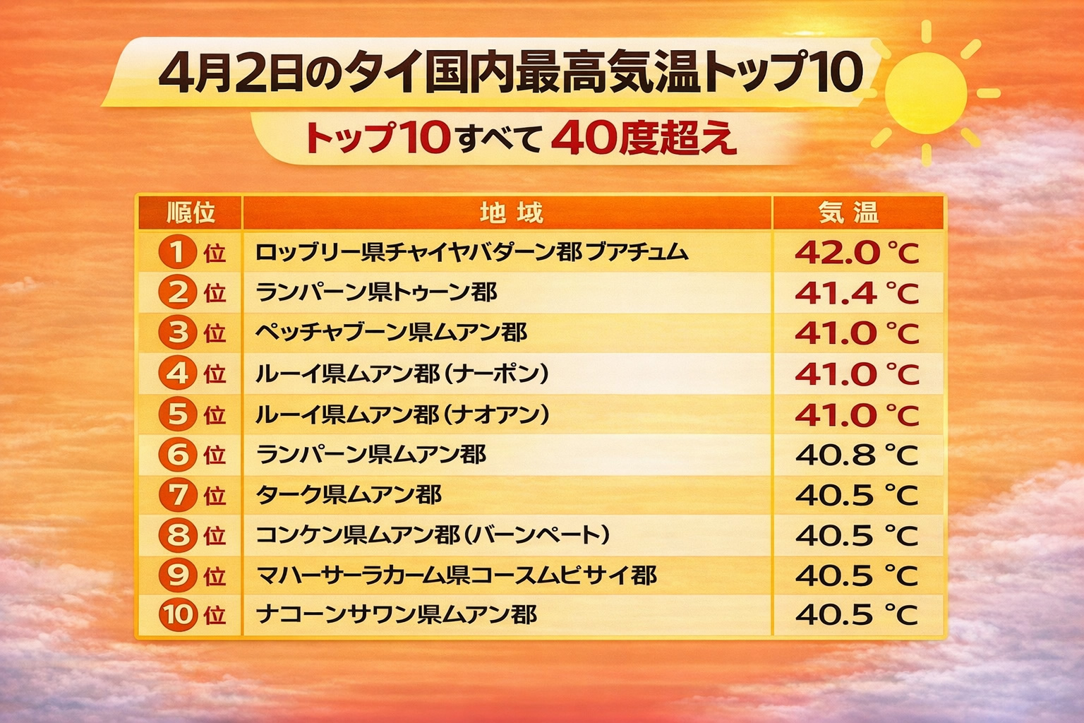 タイ気象局は、2026年4月2日の国内最高気温ランキングを発表しました。この日は各地で記録的な暑さとなり、上位10地点すべてが40度を超える猛暑となりました。