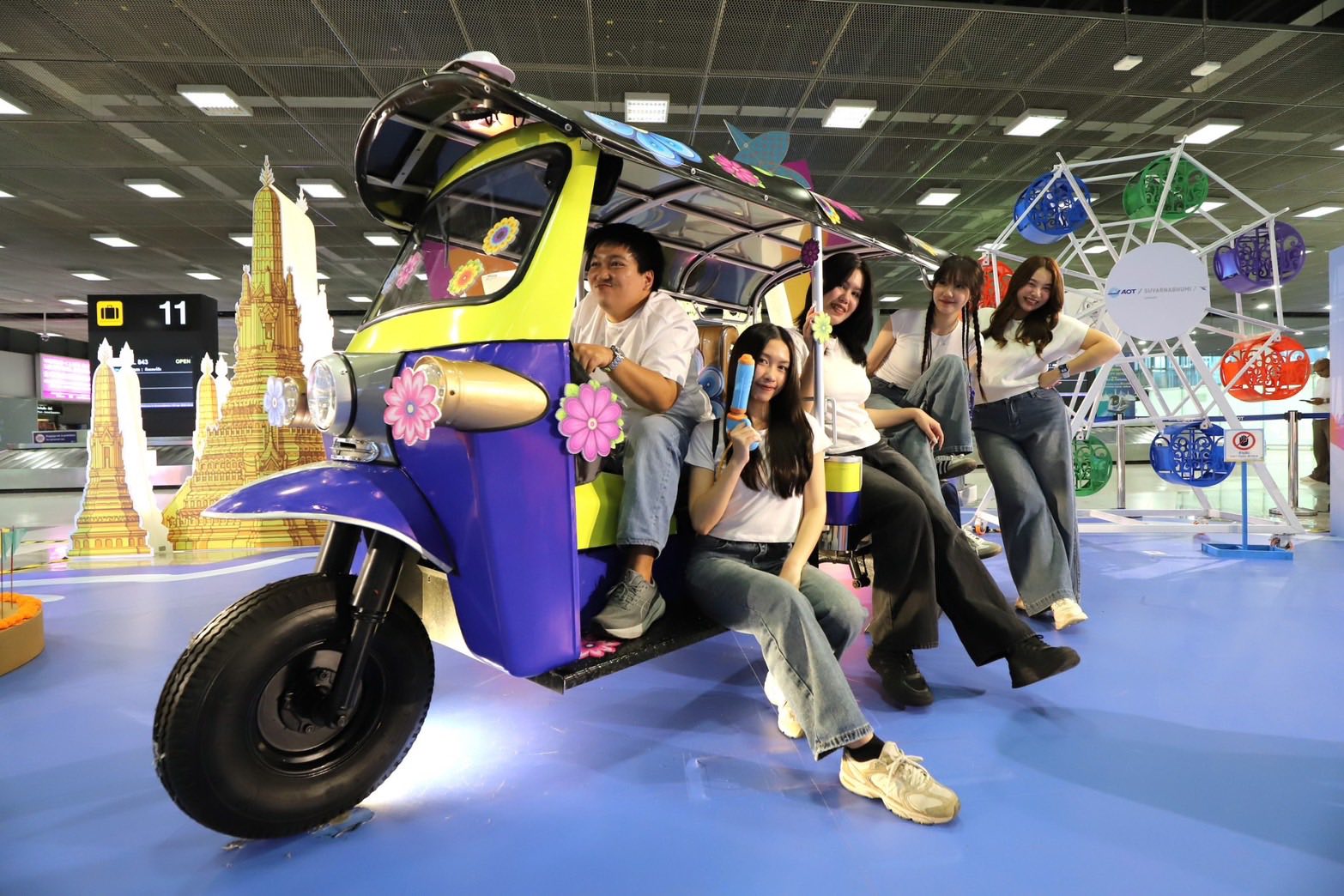 空港内の各所は、写真スポットや体験型エリアとして演出され、到着した瞬間からタイ文化を感じられる空間が広がります。特に注目は、国際線到着エリアの手荷物受取所(ベルト11〜12付近)。ここでは、ジャイアント・スイング(เสาชิงช้า)やワット・アルンの仏塔、トゥクトゥクなど、タイを象徴するモチーフが並び、記念撮影スポットとして設置されています。また、4階出発ロビー(ゲート4〜5付近)には、仏像に水をかけて祈願する「ソンクラーンの水かけ儀式」体験コーナーも用意されています。