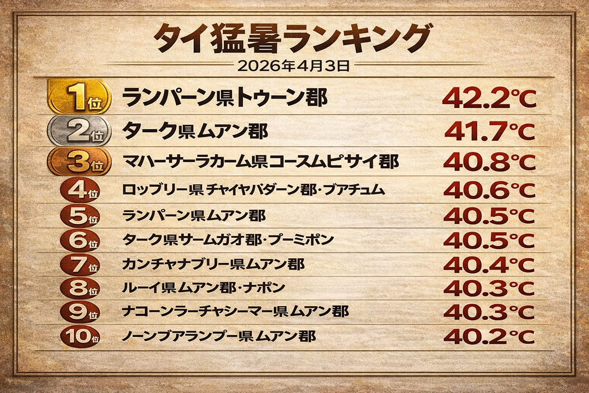 タイ気象局は2026年4月3日、同日の国内最高気温ランキングを発表しました。トップ10すべての地点で40度を超える猛暑となり、各地で危険な暑さが続いています。
