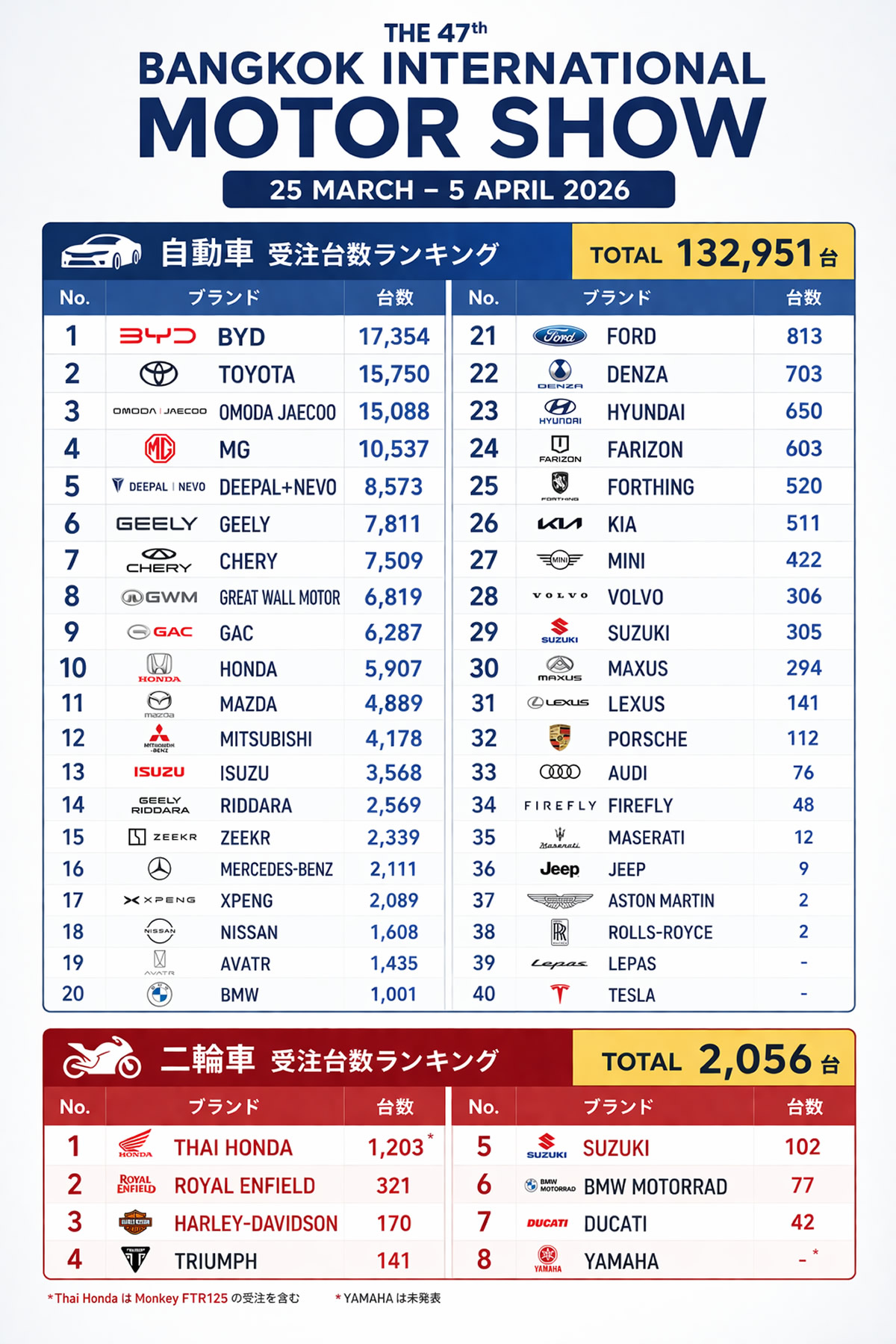 タイで開催された第47回バンコク・インターナショナル・モーターショーが閉幕し、主催のグランプリ・インターナショナル社が最終実績を発表しました。会期中の実績は、自動車132,951台、二輪車2,056台、来場者1,798,312人となりました。