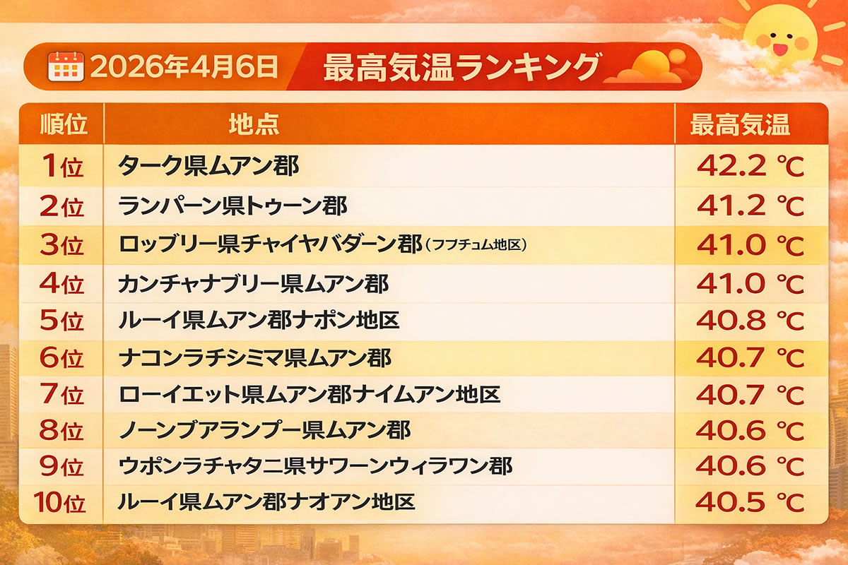 タイ気象局の発表によると、2026年4月6日の国内最高気温ランキングで、北部ターク県ムアン郡が42.2度を記録し、全国で最も高い気温となりました。上位10地点はすべて40度を超え、タイ各地で厳しい猛暑が続いています。